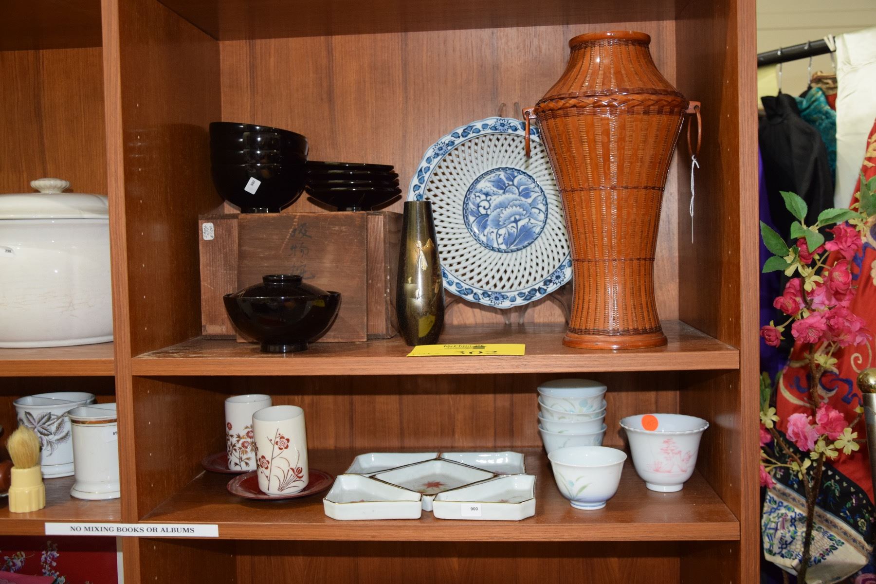 MIXED LOT: BAMBOO BASKET, LACQUER, BOWLS, CUPS & VASES