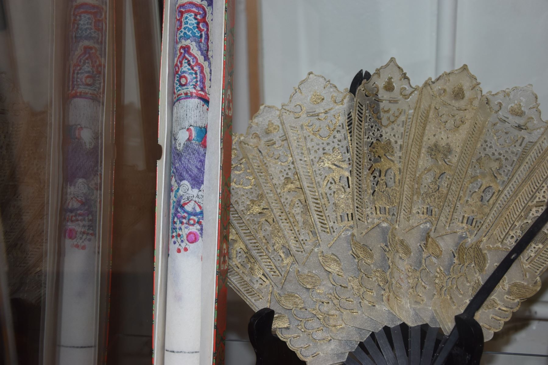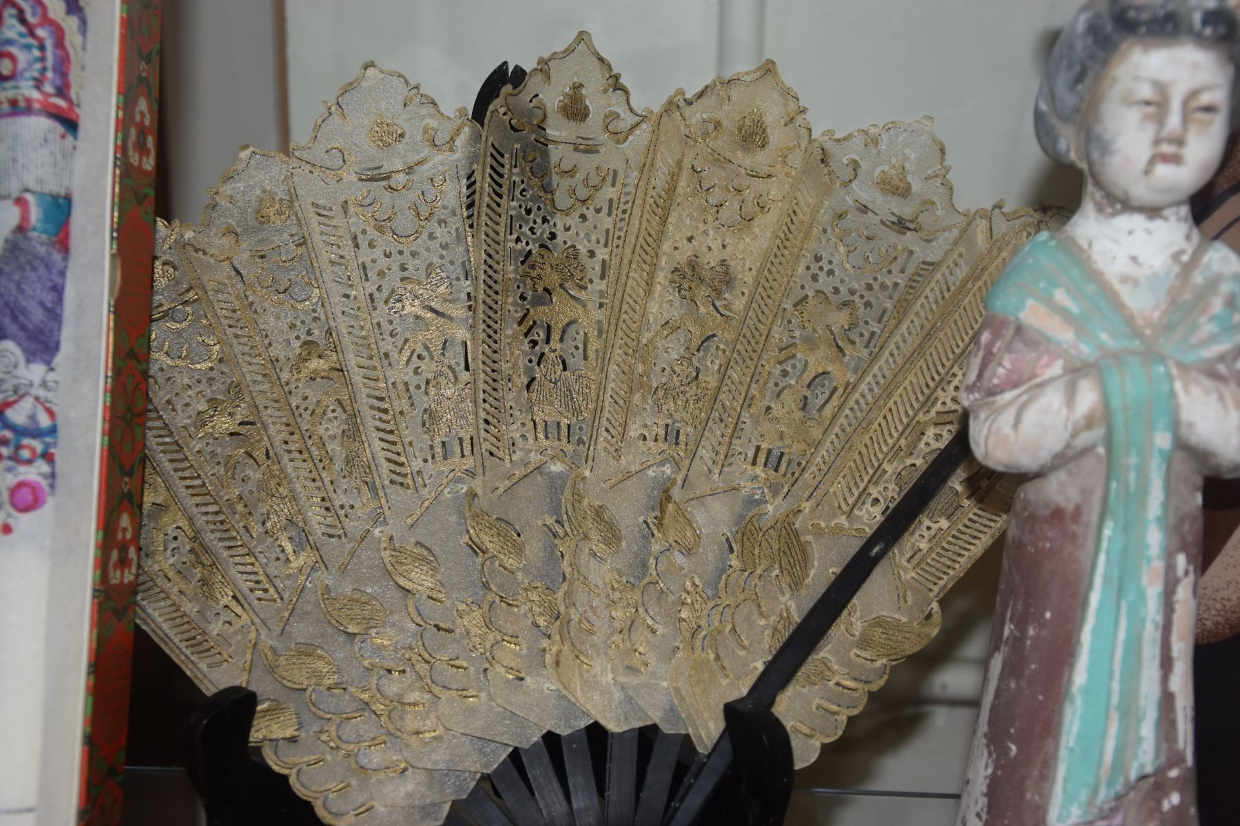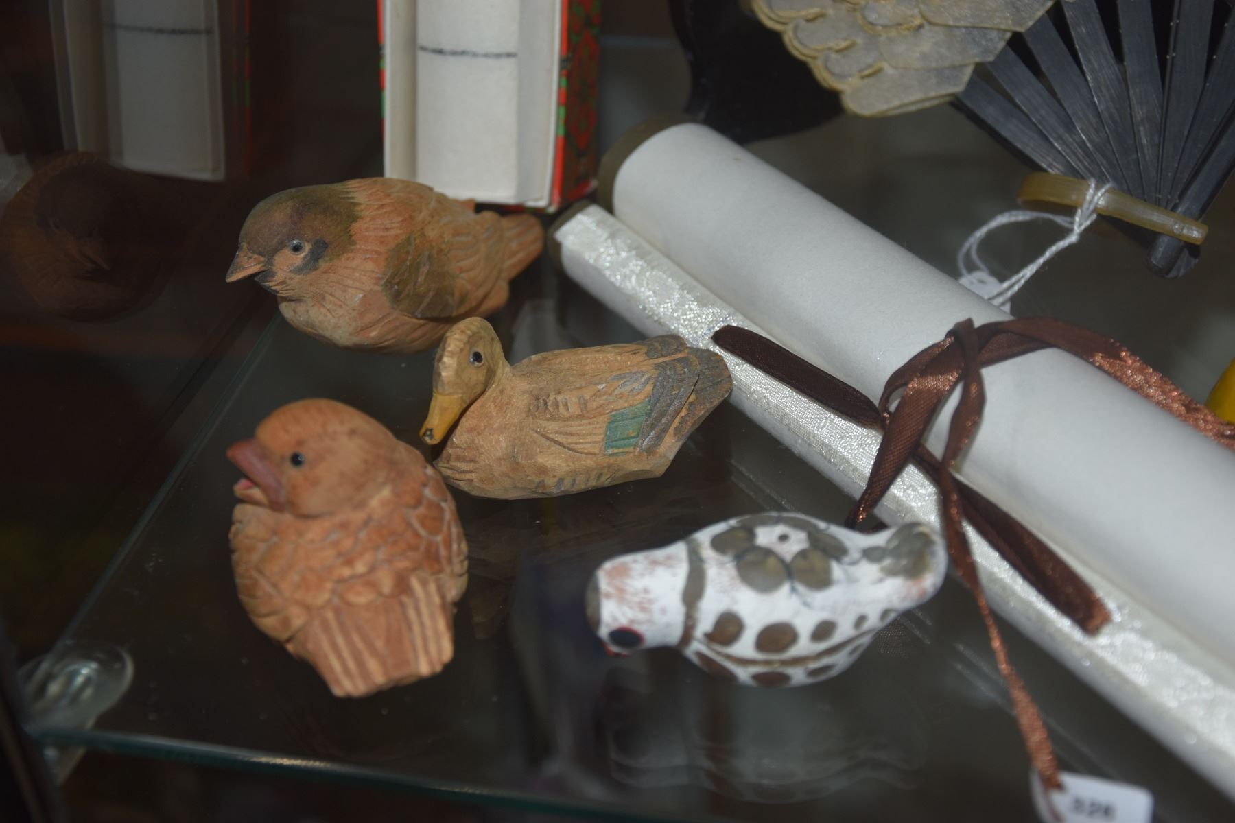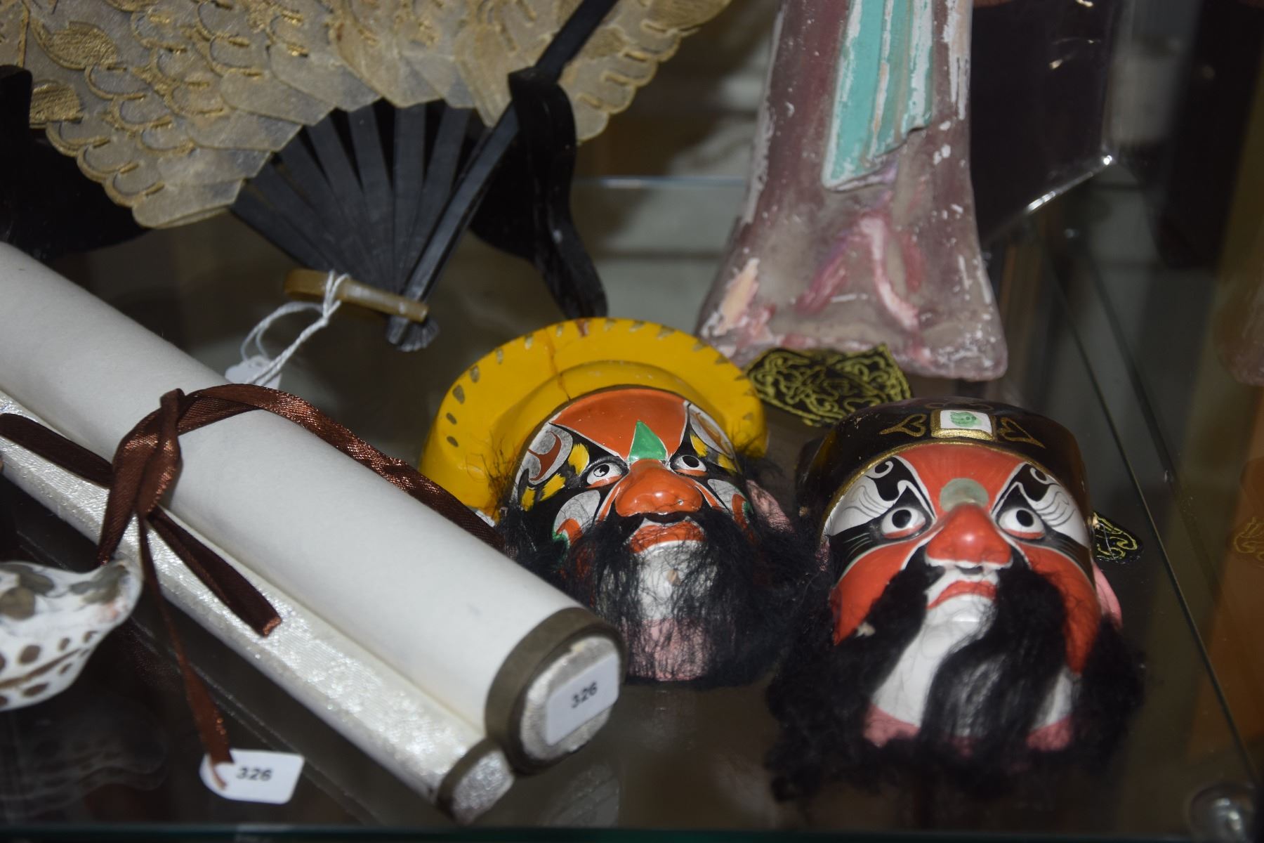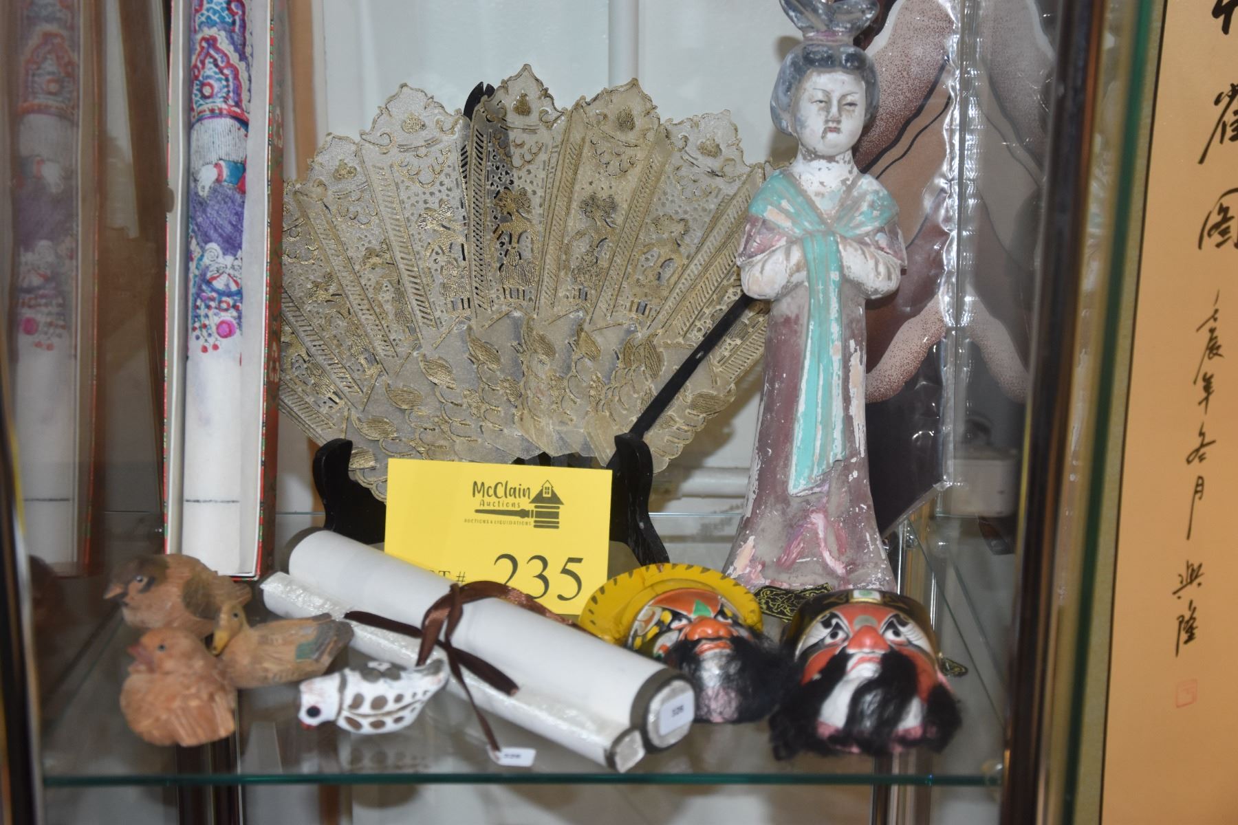 MIXED LOT: CARVED BIRDS, FAN, SCROLL, MASKS, STATUE CHOP STICKS & TIE (12 PCS) (DOES NOT INCLUDE STAND)
