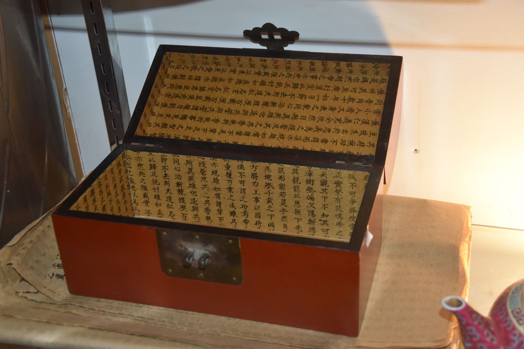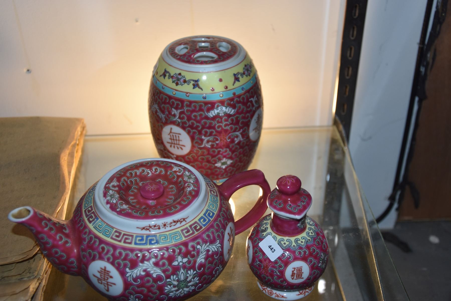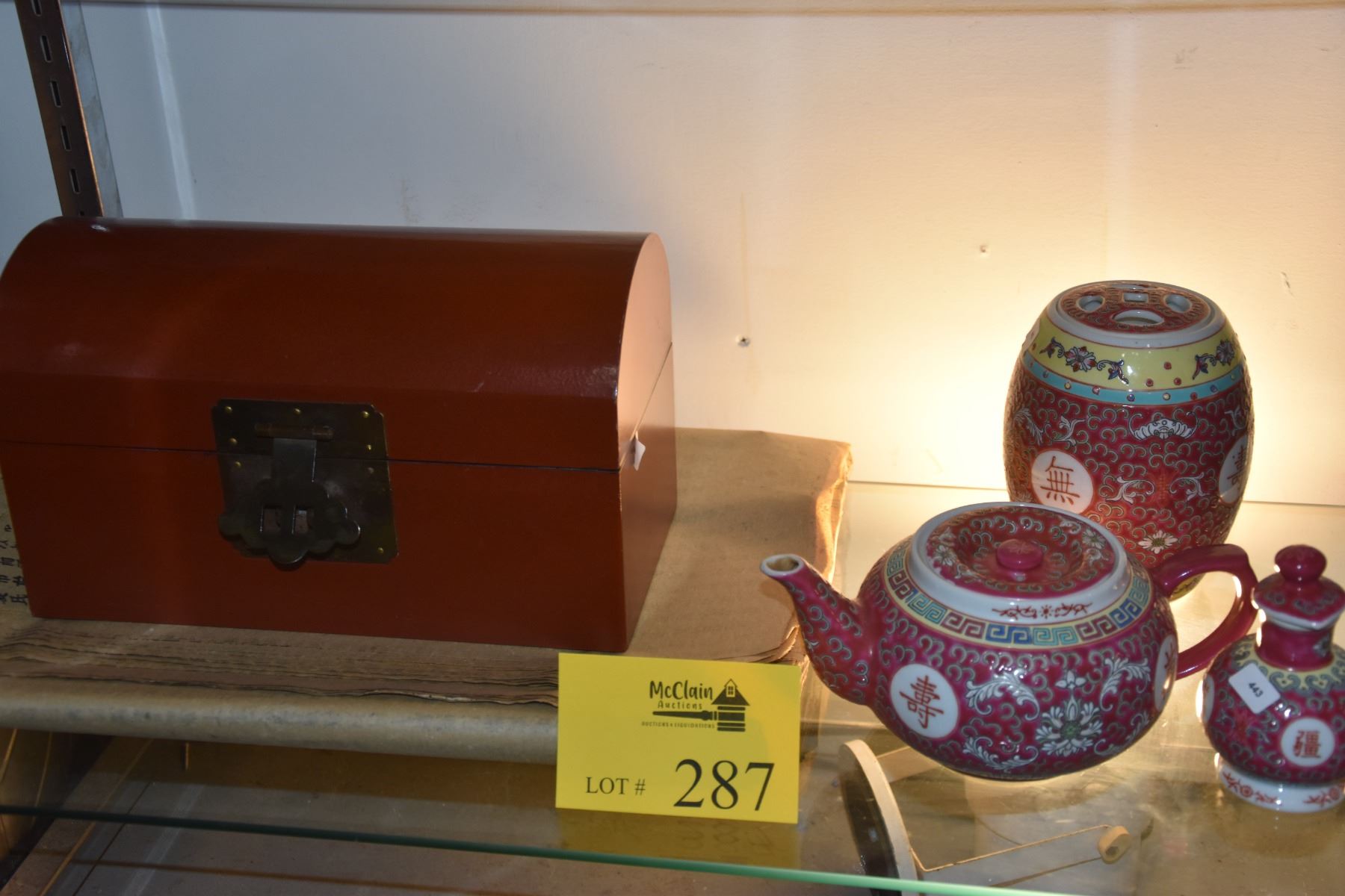 MIXED LOT: CHINESE PORCELAIN TEAPOT, SHOYU & TEA CONTAINER, LETTER BOX & WRAPPING PAPER (5 PCS)