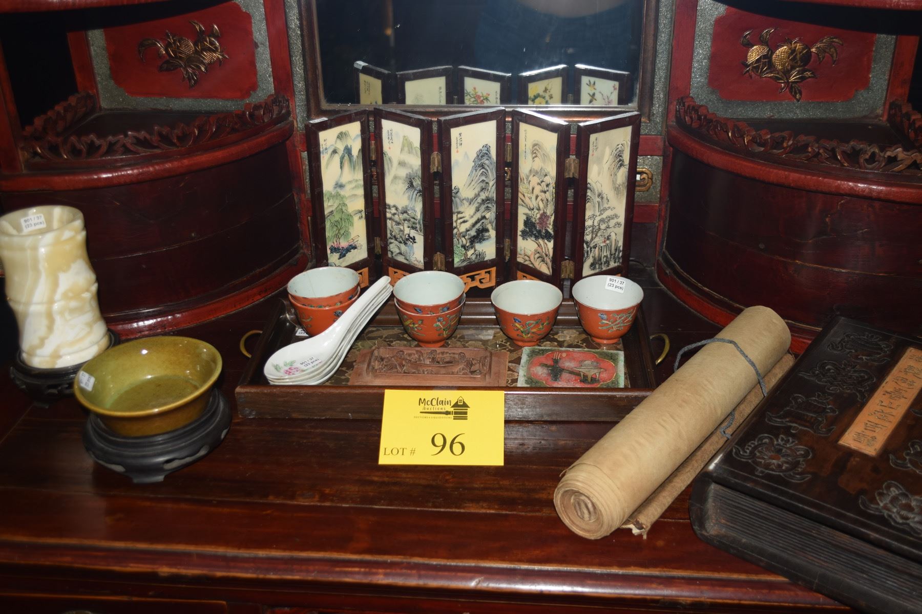 MIXED LOT: CHINESE TEACUPS, SOUP SPOONS, TABLE SCREEN, BRUSH HOLDER, DISH ON STAND, SCROLL, BOX & TRAY (18 PCS)