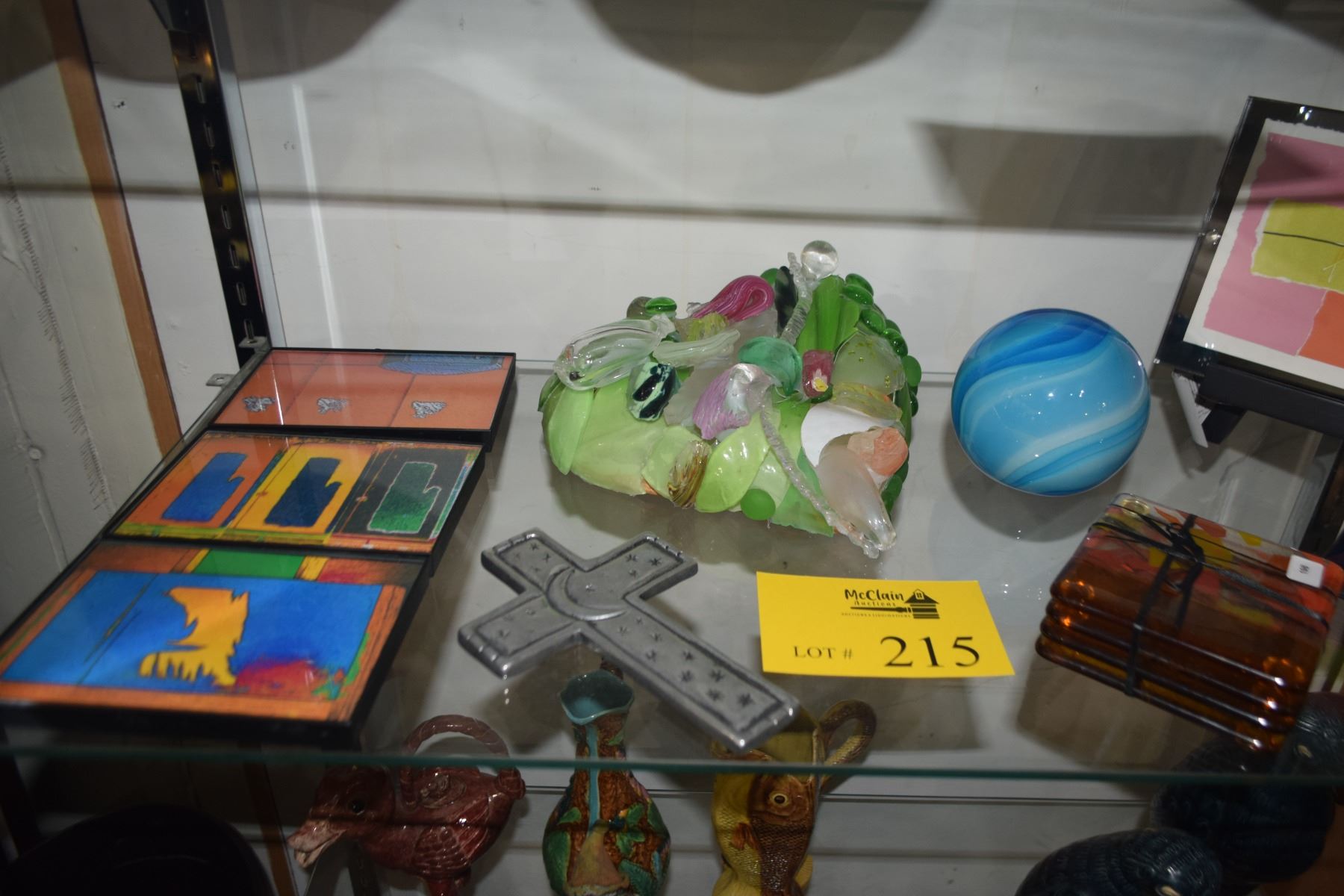 MIXED LOT: GLASS HEART BY ROY VENTER, WALL ART, GLASS COASTERS, PAPERWEIGHT & CROSS (9 PCS)