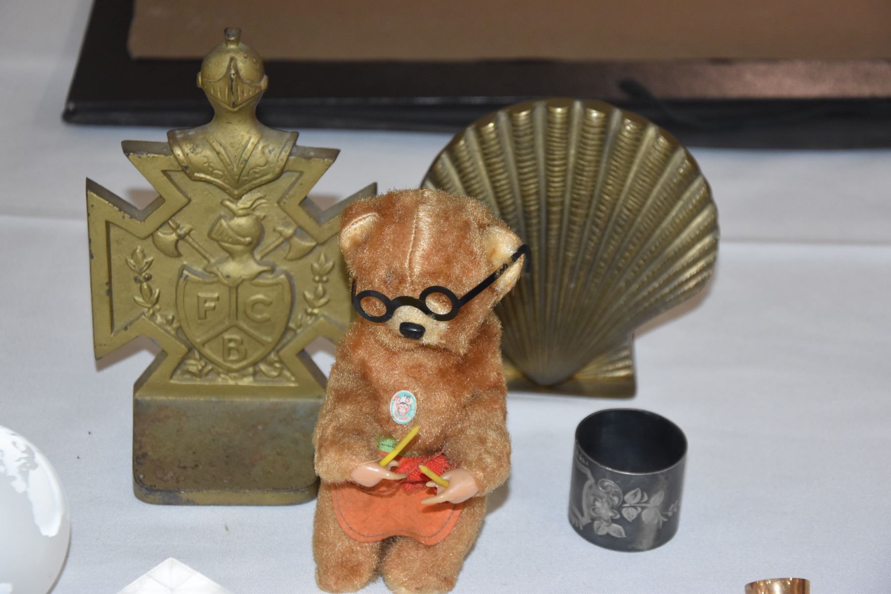 MIXED LOT: LIMOGE EGG, GLASS BIRDS, WIND UP MAX CARL KNITTING BEAR, BOOK ENDS, ETC. (12 PCS)