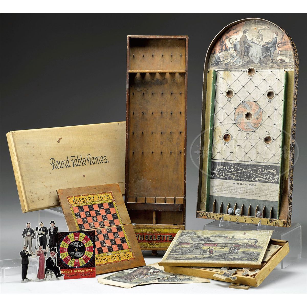 1) Large hand painted Bagatelle marble game showing children at play in parlor. Comes with three early swirled marbles. Circa 1870. 2) Boxed set of "Round Table Games". Includes "Peter Coddles" card game, "Mr. Pickwick's" card game, "Jack Straws", "Alphabet" game, and "Words and Sentences". 3) A Bliss Mfg. checkers game folding table top. 4) "Wheelette" large wooden based ring toss game. 5) Early Pennsylvania Railroad paper on wood puzzle. Box top and puzzle are hand colored. Complete set includes three other assembled puzzles. 6) Charlie McCarthy's Radio Party! Copyright 1938 radio premium. Send in your 25 cents and box top and receive this paper radio premium. Features stand up figures of actors from show including Edgar Bergen and Charlie McCarthy. All contained in original mailing envelope. SIZE: Largest 25" l. PROVENANCE: The Diane and late Steve Olin collection. CONDITION: Good to very good. 13271-37
