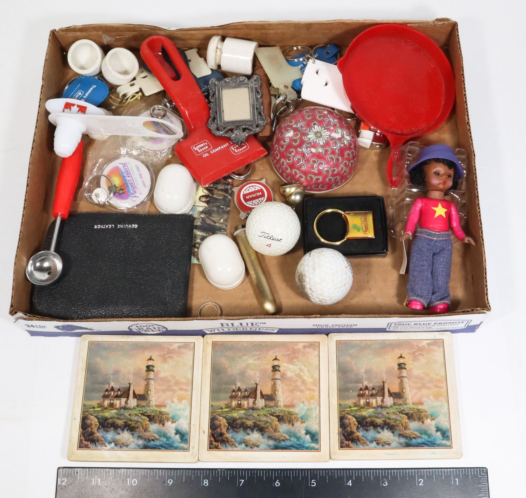 MIXED LOT OF KEYCHAINS, COASTERS, LEATHER