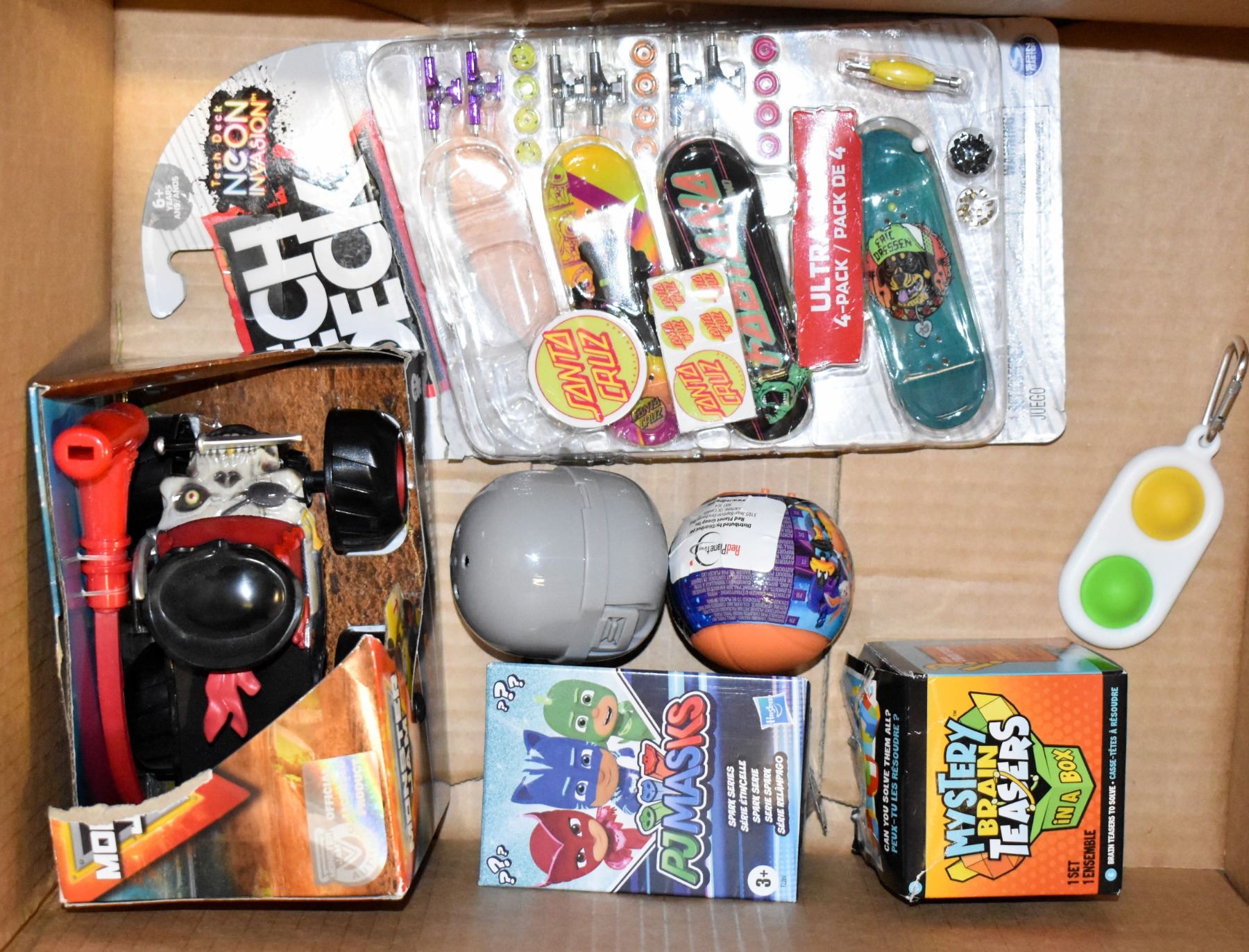 PIRATES CURSE SPIN RIPPER, PACK OF TECH DECKS WITH ONE DECK MISSING, PJ MASKS SPARK SERIES TOYS, GREY MARIO KART SURPRISE TOY, MYSTERY BRAIN TEASERS IN A BOX SET, SPACE JAM MINI FIG, KEYCHAIN FIDGET TOY