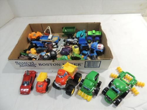 MIXED LOT OF PLASTIC TOY VEHICLES, WORKMEN, AND NEAT STUFF. AS SHOWN. VIEW PICTURE FOR DETAIL.