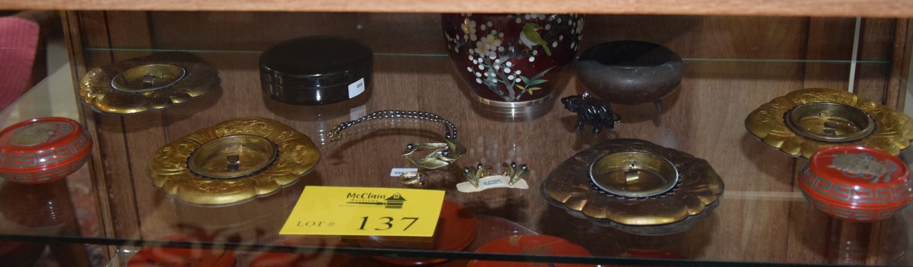 MIXED LOT: SHOJI DOOR HANDLES (4), INCENSE CASES (3), CLOISONNE VASE & MISC. JEWELRY (13 PCS)