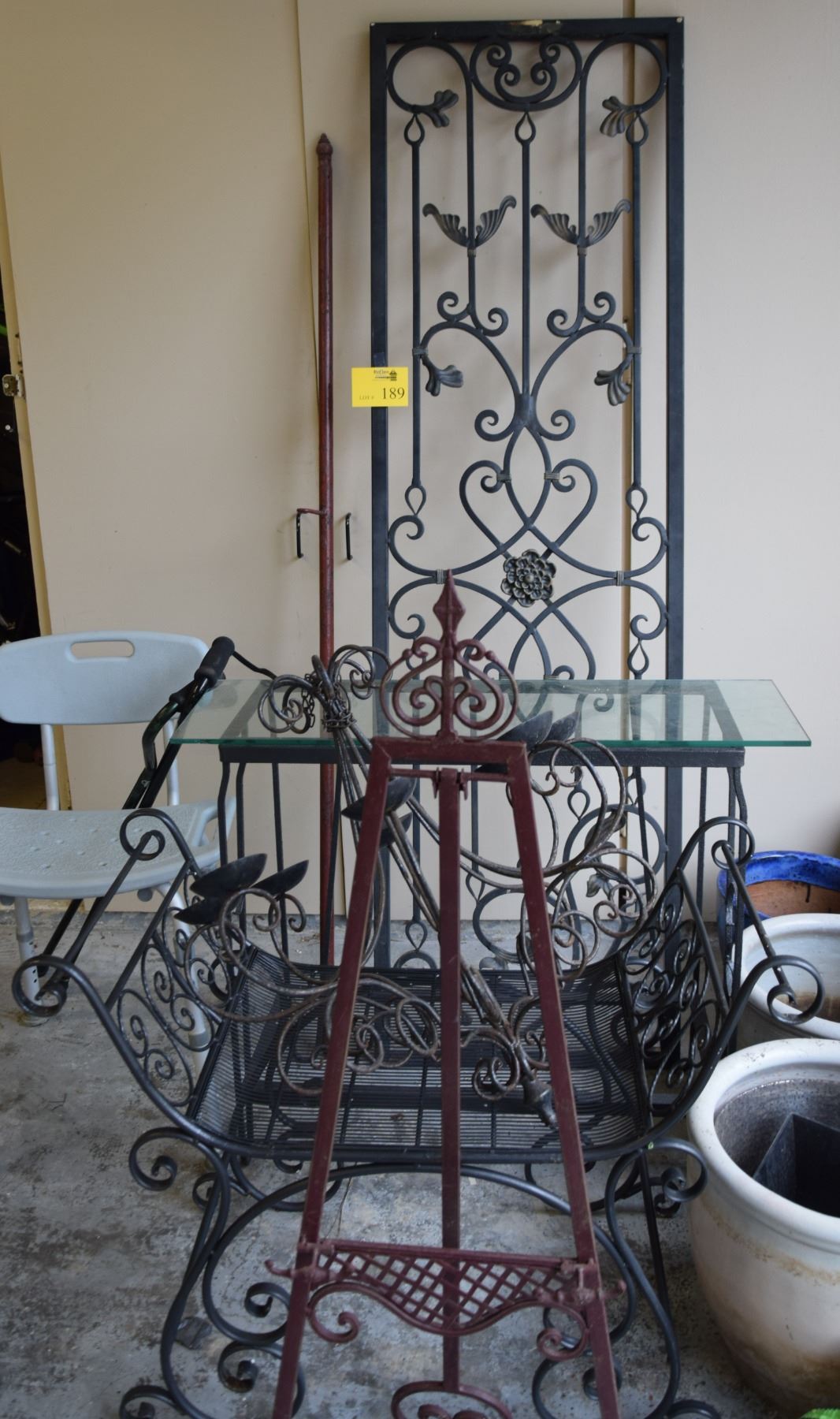 MIXED LOT: TABLE, BENCH, EASEL, CANDLE HOLDER & PANEL
