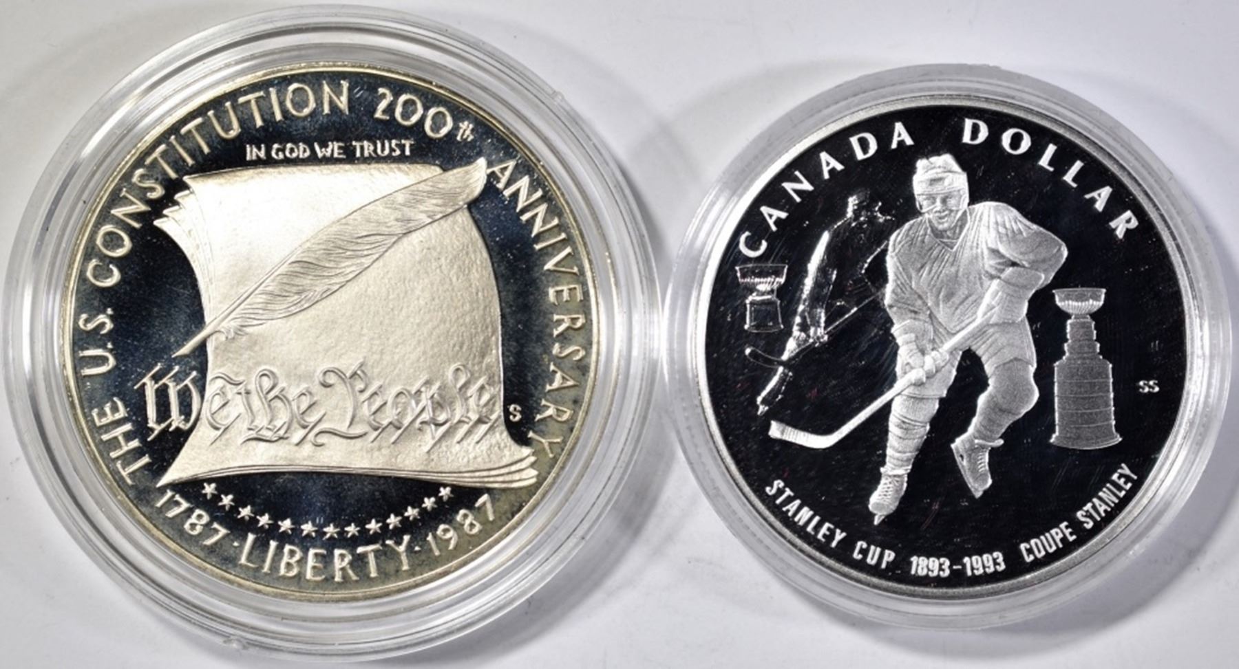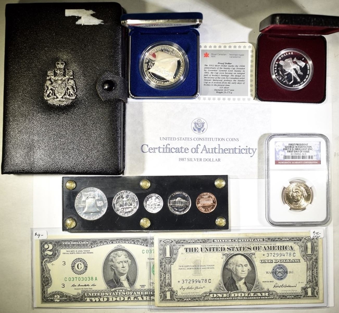 1977 CANADA DOUBLE DOLLAR PROOF SET, 1993 CANADA PROOF DOLLAR STANLEY CUP, 1987 CONSTITUTION PROOF SILVER DOLLAR, 1963 US PROOF SET IN PLASTIC HOLDER, 2007-D GEORGE WASHINGTON DOLLAR NGC FIRST DAY ISSUE, 2013