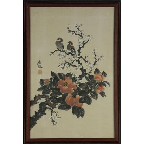 INK AND COLOR ON PAPER 27.5'' X 18.5''. Framed Chinese ink on paper depicting two birds on intertwined flowering branches. Late 20th c.
