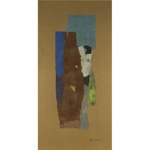 MIXED MEDIA COLLAGE ON BOARD, 36 1/2'' x 18 1/2'', Paul Horiuchi (1906-1999), WA. Abstract Composition in Blue & Rust on a Gold Background. Signed lower right. Placed in a silvertone frame with beige fabric matting. Heralded as the ''Master of Collage'', Horiuchi's pieces exhibit an oriental influence wrought from his childhood in Japan. Horiuchi held a close and long-term relationship with Northwest Master Mark Tobey who shared his interest in Zen philosophy and Asian antiques. More info. in the white binder.