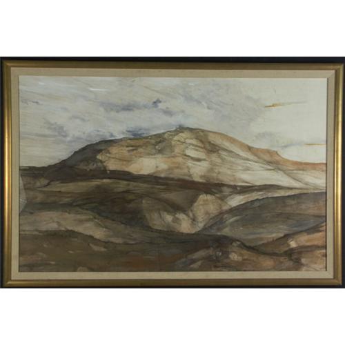 MIXED MEDIA ON PAPER 35 1/2'' x 56 1/2'', Attributed to John Caldwell (1942-), Australia. Ayers Rock (Holy Place of the Aborigines). Unsigned. Placed in a goldtone frame with beige fabric matting, as seen. More info. in the white binder.