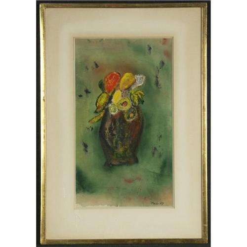 MIXED MEDIA ON PAPER, Pehr Hallsten (d. 1965), WA. A Vase of Flowers. Signed and dated ''57'' lower right. Matted with padded matting and placed in a simple wood frame with gold trim. More info. at the front desk. 13.75'' x 7.75''/ 19.5'' x 13.5'' framed.