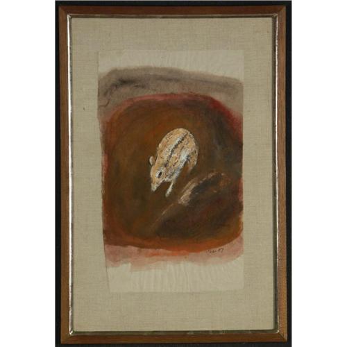 MIXED MEDIA ON PAPER, Pehr Hallsten (d. 1965), WA. A Mouse. Signed and dated ''57'' lower right. Floating presentation against beige fabric matting placed in a simple wood frame with silver trim. More info. at the front desk. 14.25'' x 8.25''/ 20'' x 13.5'' framed.