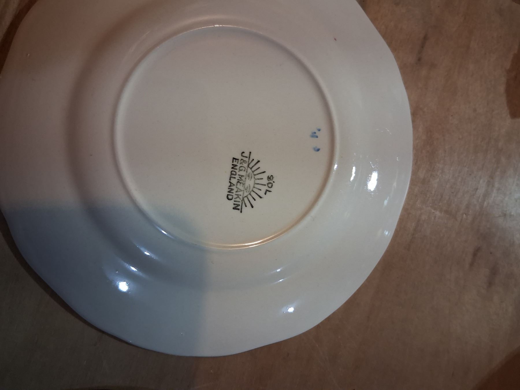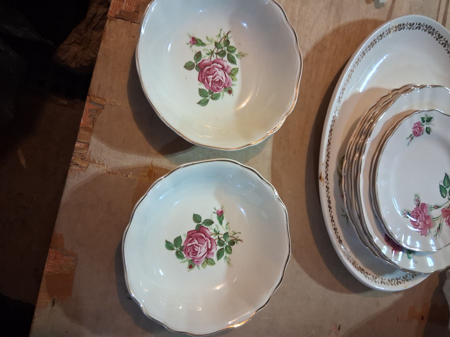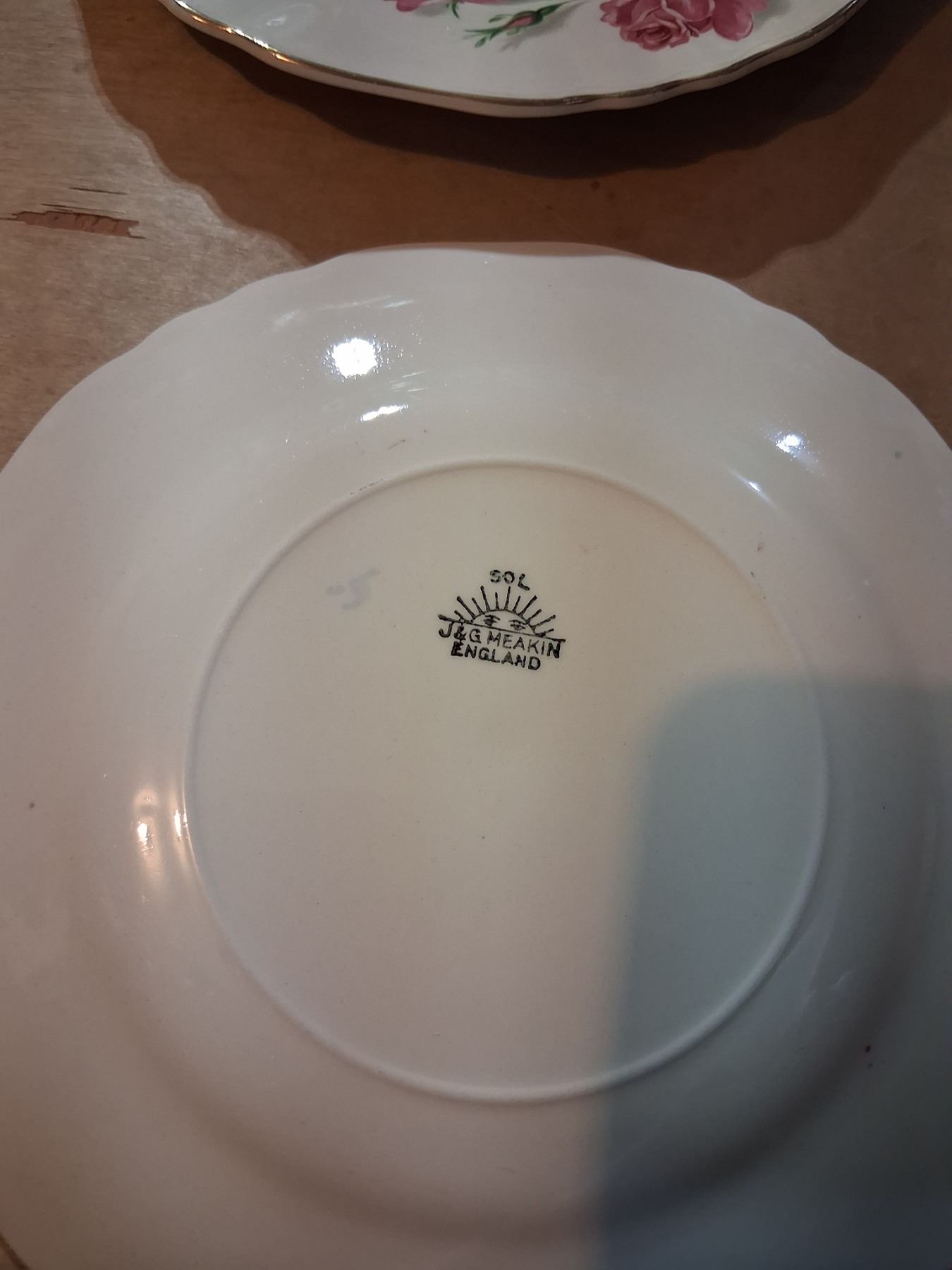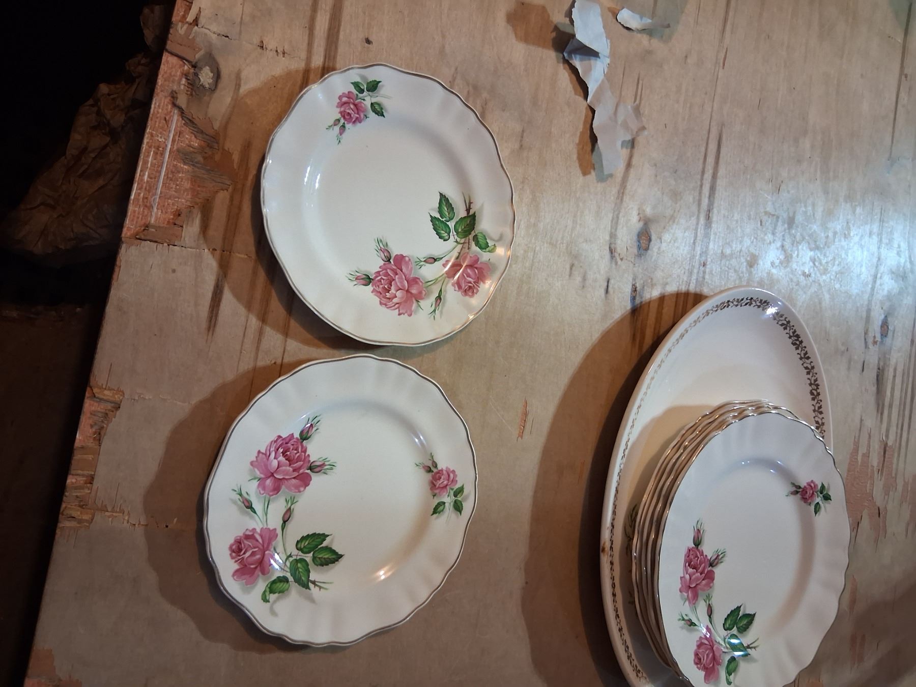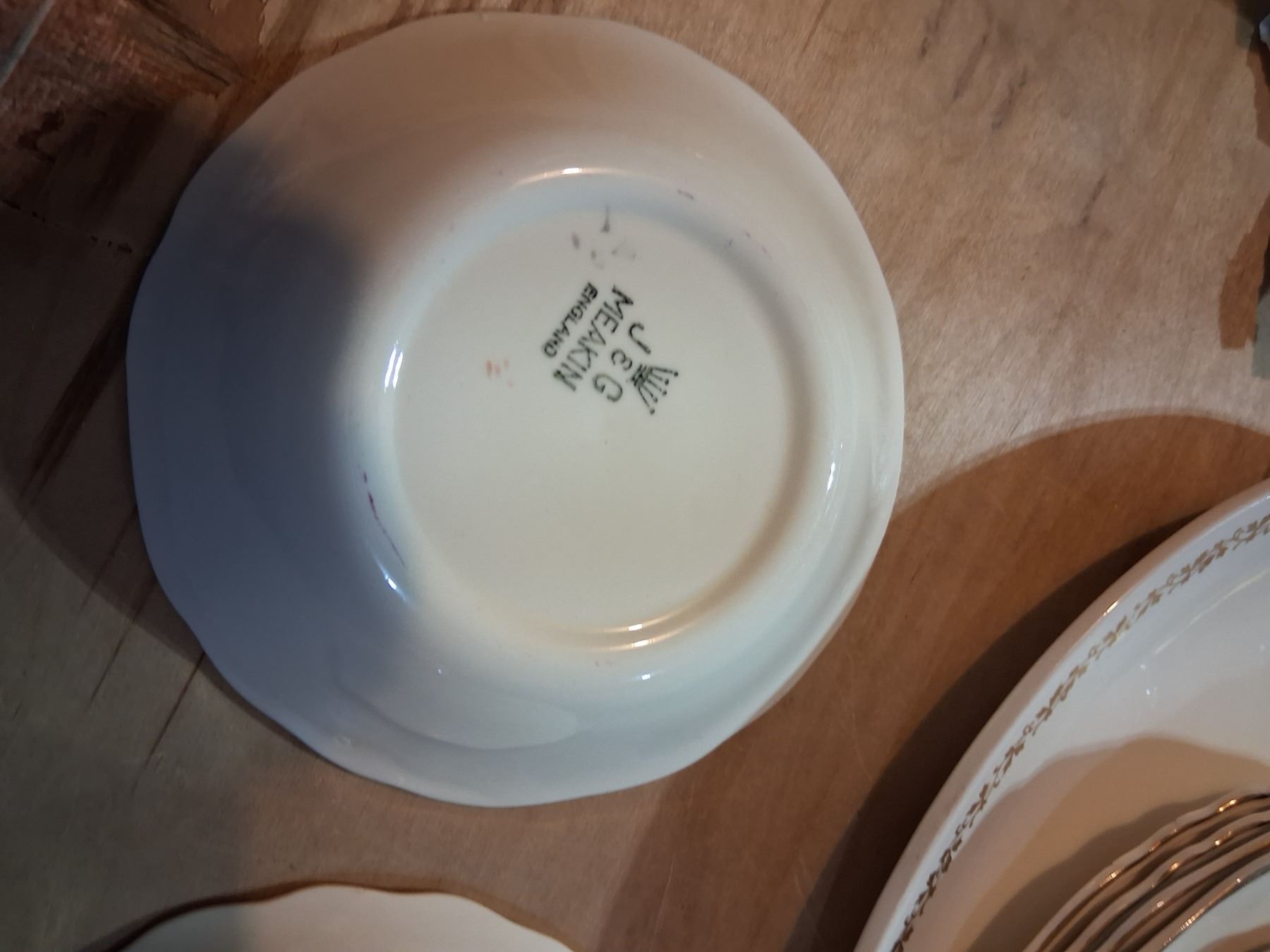 3ea small plates rose bouquet, 10ea pieces of J & G Meakin bone china, 2ea milk glass bowls