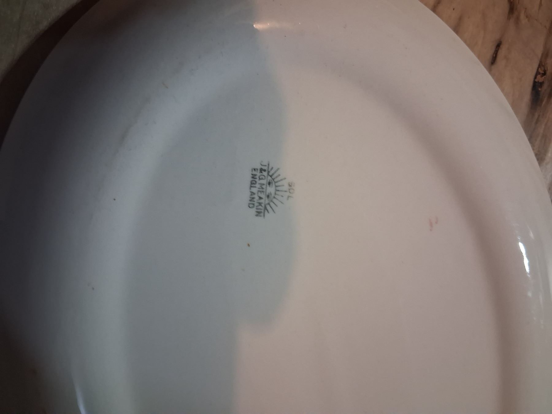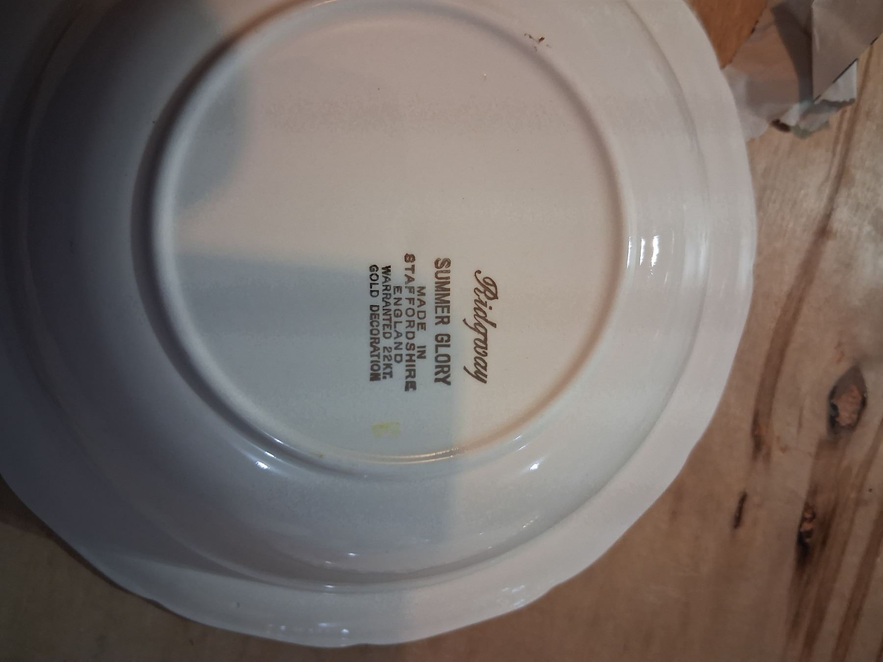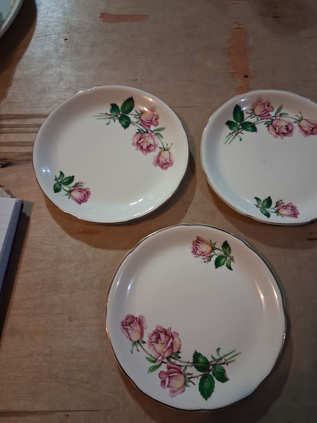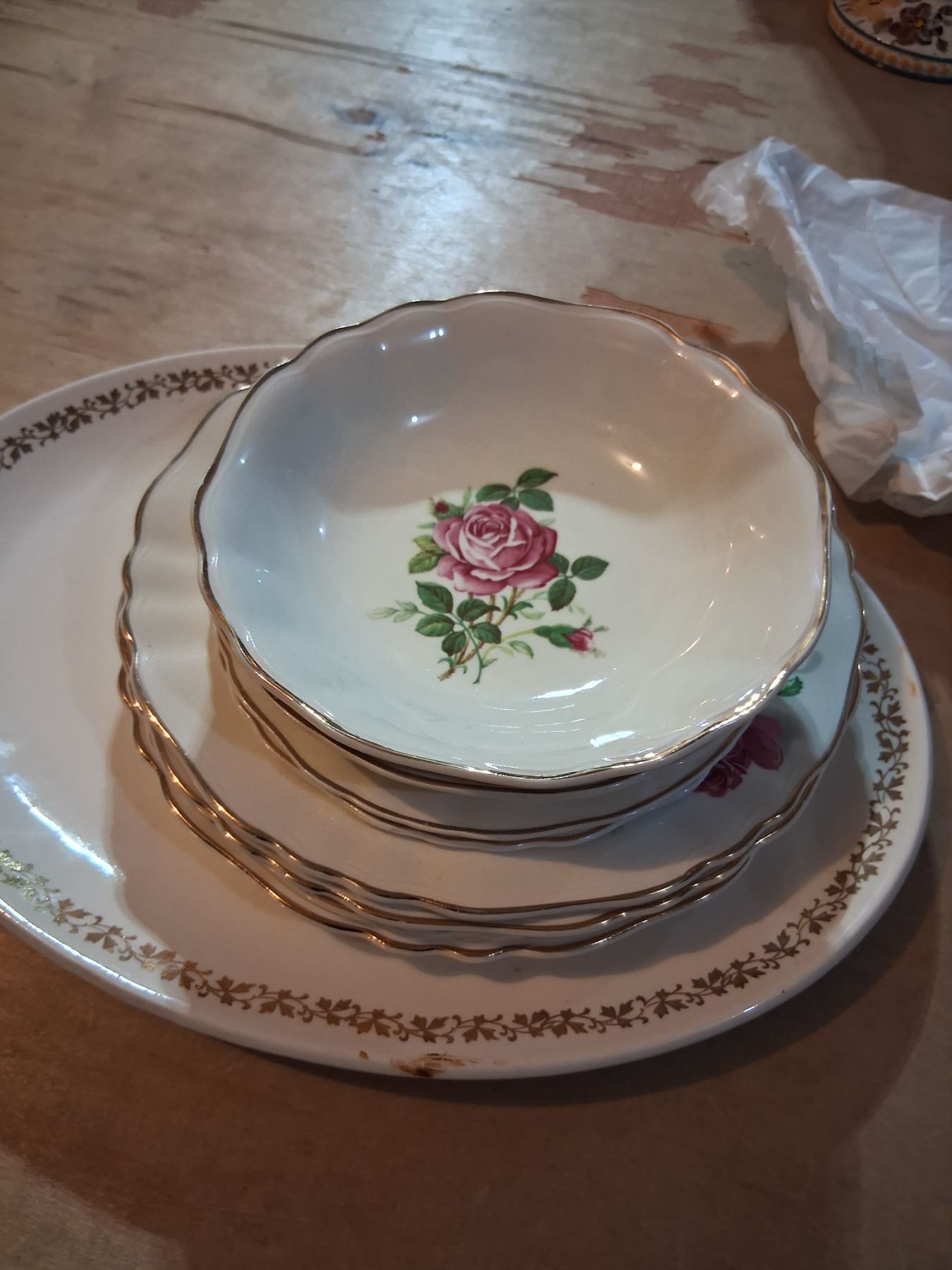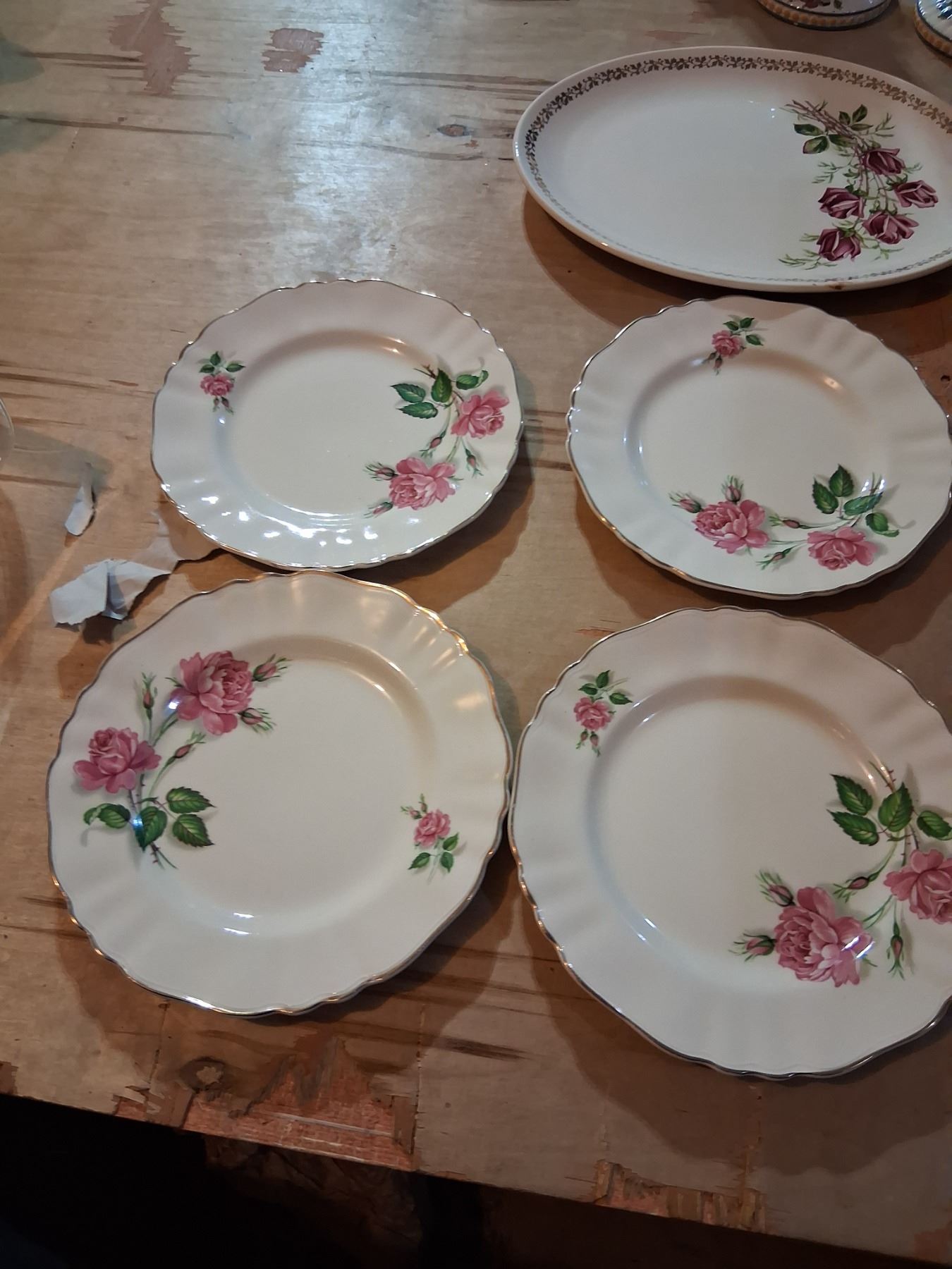 3ea small plates rose bouquet, 10ea pieces of J & G Meakin bone china, 2ea milk glass bowls