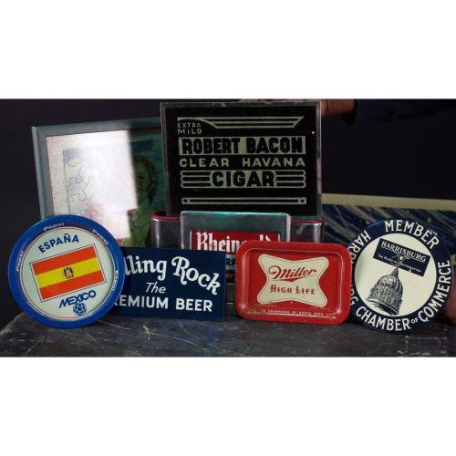MIsc lot of 7 Items Robert Bacon Cigar Sign Rolling Rock Beer Glass Sign Kellogg's Puzzle (framed) Rheingold Beer Display Miller High Life Tip Tray Pepsi-Cola Mexico Round tip tray Round plastic Chamber of Commerce Member Sign Harrisburg, Pa