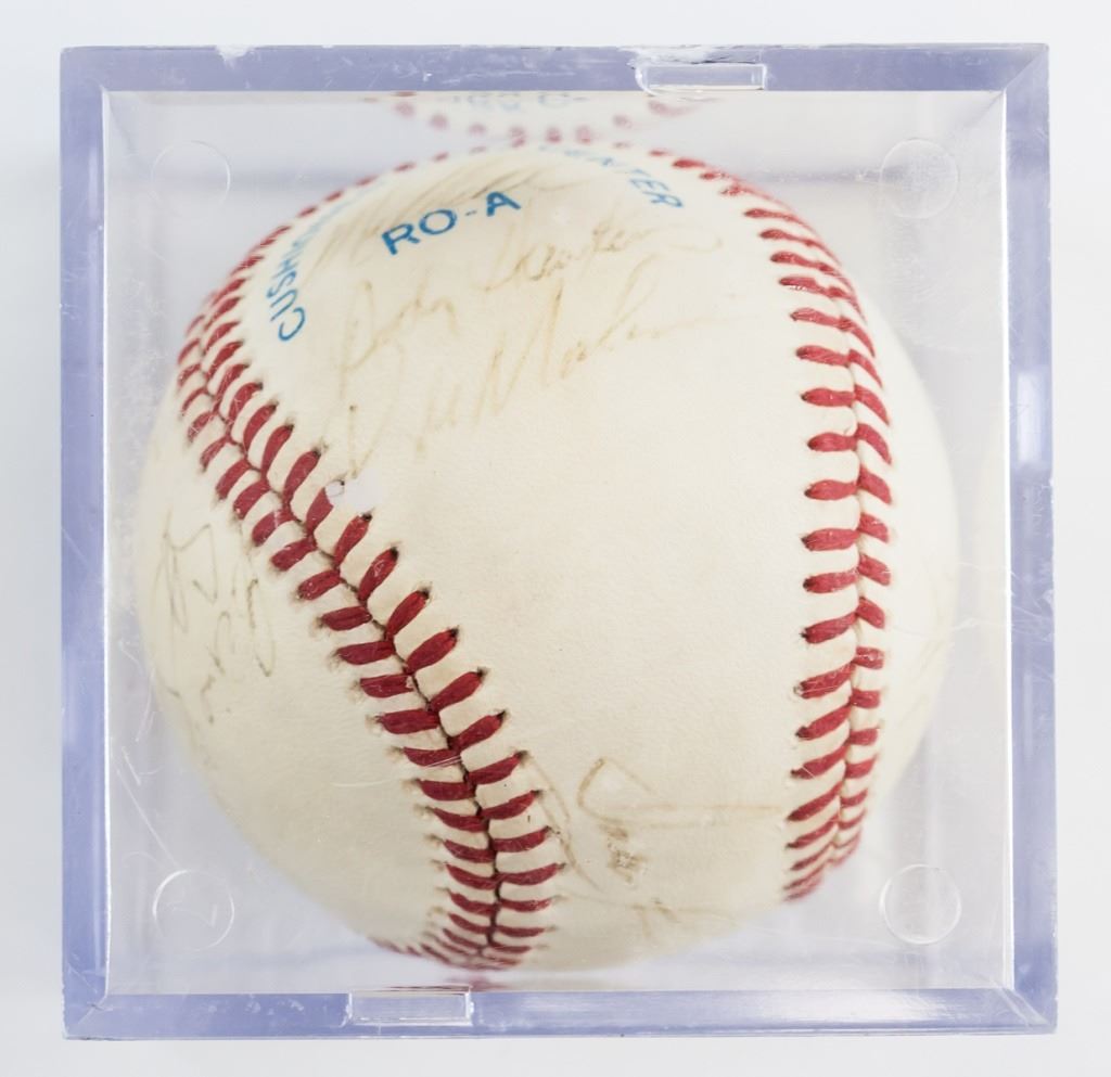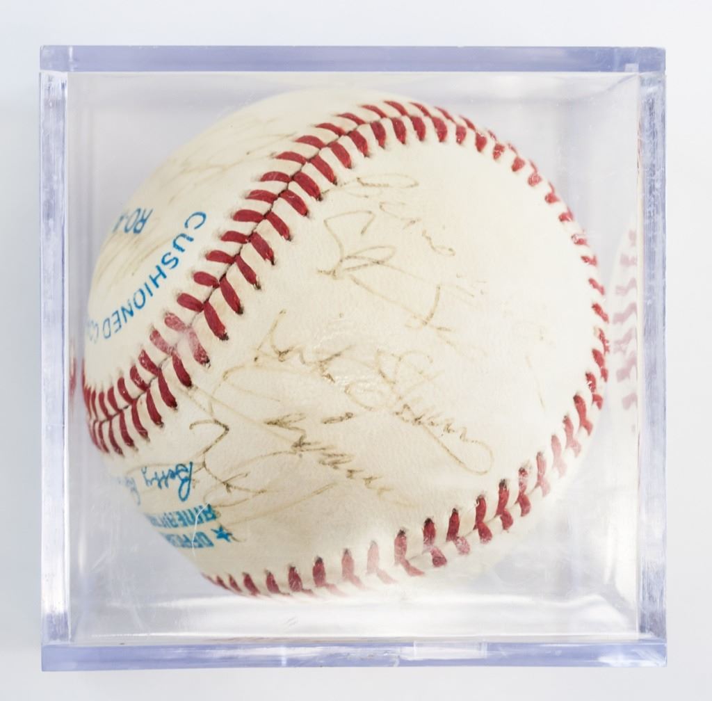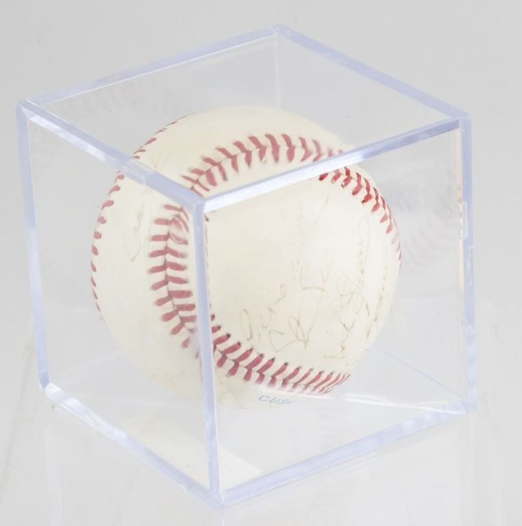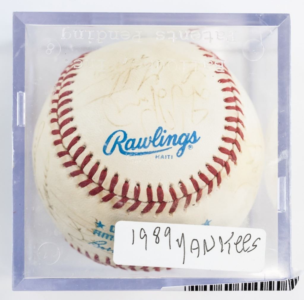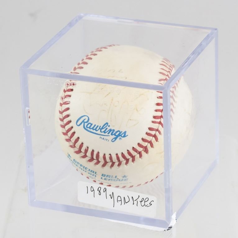 1989 Yankees baseball, signed. Incased in plastic. 8 x 8 x 8 cm, 268g .