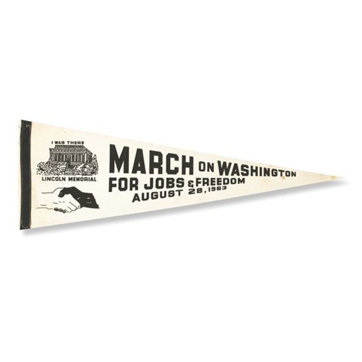 Nicely preserved black and white pennant from the ''March on Washington for Jobs and Freedom'' held in Washington DC on 28 August 1963 where Martin Luther King, Jr. delivered his ''I Have a Dream'' speech. Pennant reads ''I Was There / Lincoln Memorial'' and ''March on Washington For Jobs and Freedom August 28, 1963''. Measures 26'' in white felt with block lettering in black. Some staining else very good. A rare collectible for the most famous Civil Rights march on Washington.