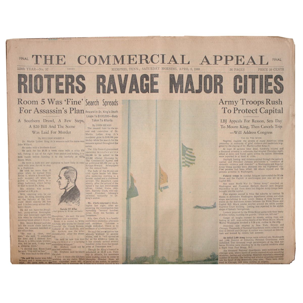 Memphis, Tennessee newspaper ''The Commercial Appeal'' dated 6 April 1968, two days after Dr. Martin Luther King, Jr. was assassinated in that city. 60 pages, detailing the murder of the civil rights leader and chilling early details on his assassin. Well-preserved newspaper has headlines including ''Rioters Ravage Major Cities'' and ''Violence Shatters Deceptive Calm''. Newspaper measures 15'' x 24'' unfolded and 15'' x 12'' folded. Toning throughout with minimal chips and wear, else very good condition.