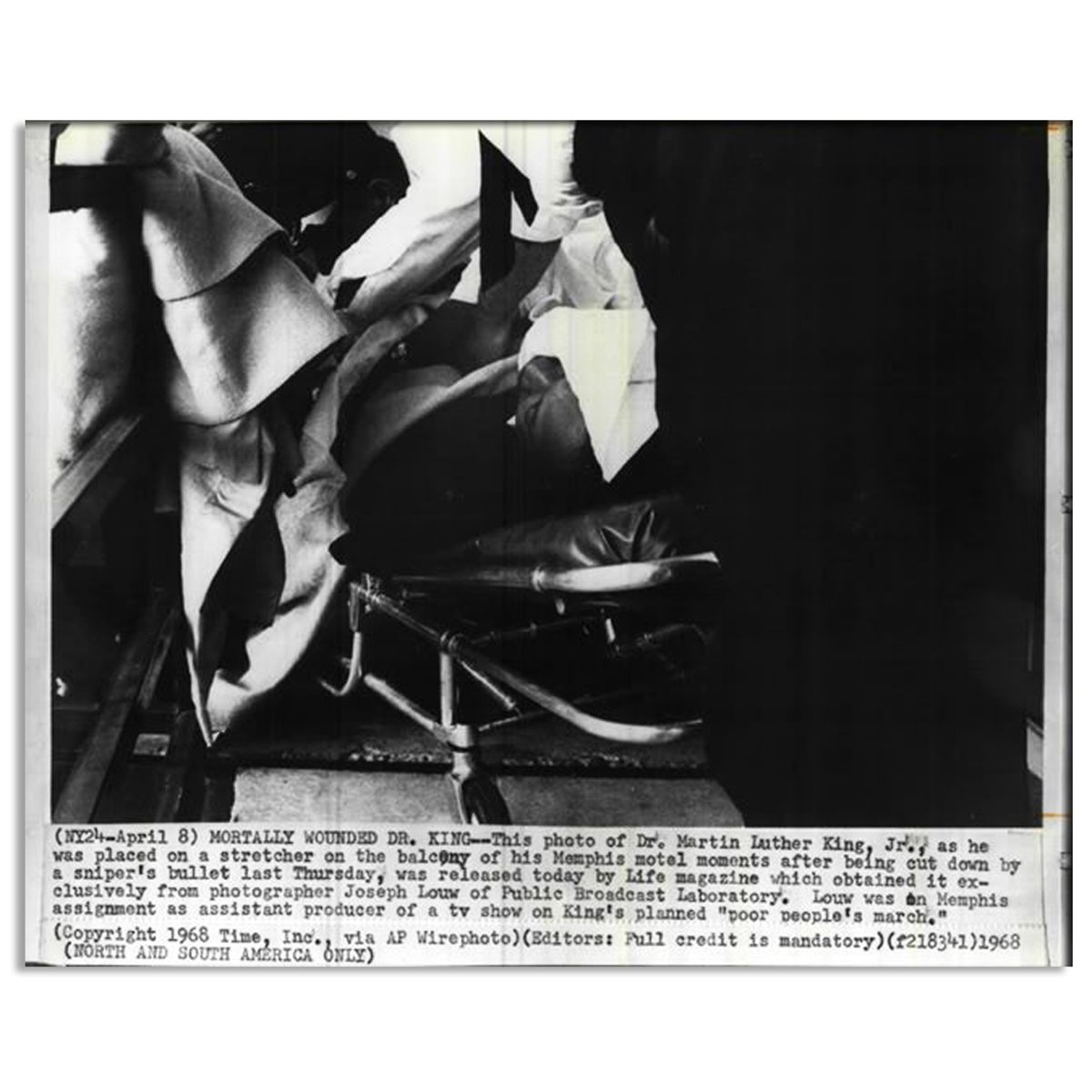 Official Associated Press wire photo depicting Martin Luther King, Jr. being carried on a stretcher after being shot by James Earl Ray. Caption reads in part: ''...Mortally Wounded Dr. King...as he was placed on a stretcher on the balcony of his Memphis hotel moments after being cut down by a sniper's bullet...'' Glossy photo measures 8.5'' x 6.5'' with minor smudging in pink along border, else near fine.