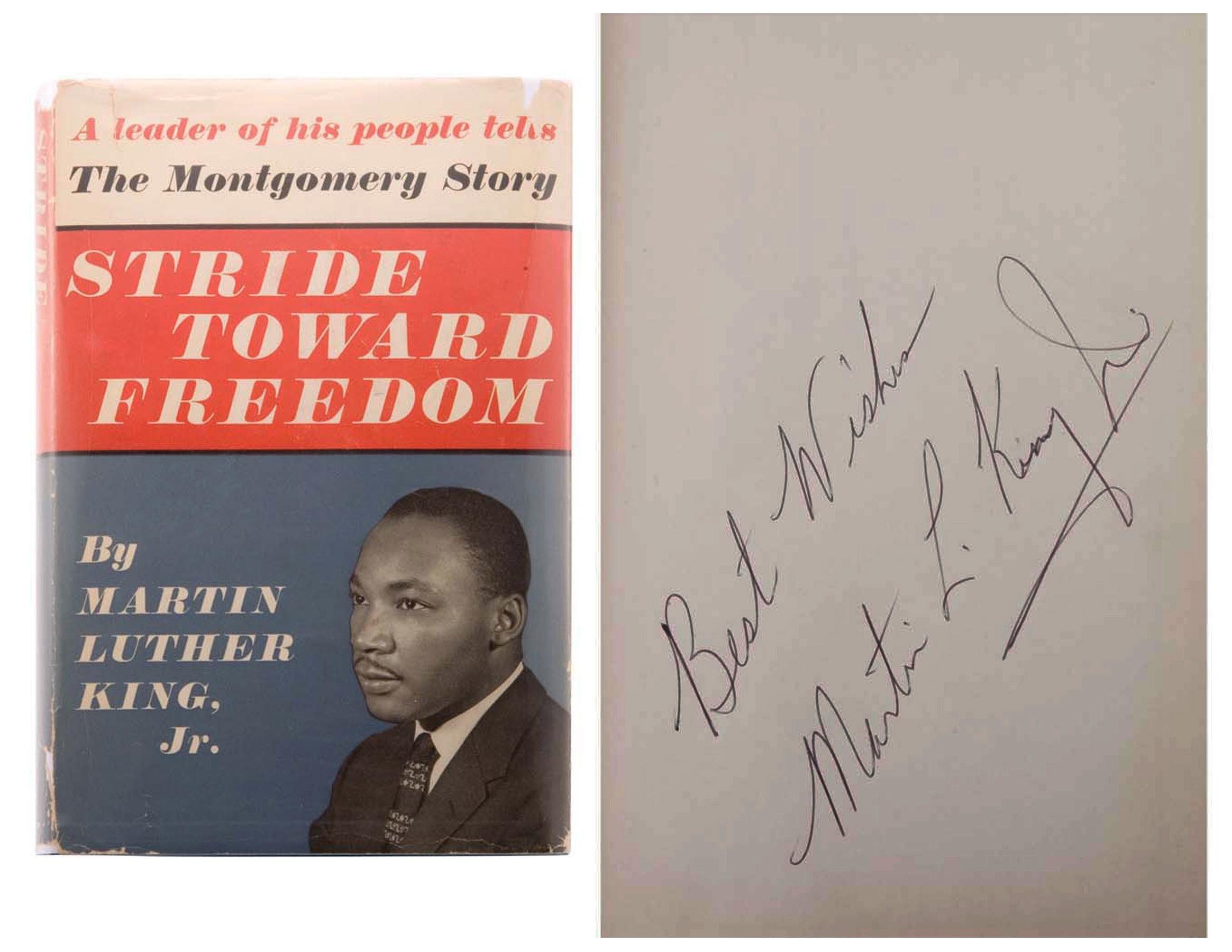 Dr. Martin Luther King Jr. signed copy of his first book ''Stride Toward Freedom: The Montgomery Story.'' New York: Harper and Row Publishers: 1958. King signs the front free endpaper ''Best Wishes / Martin L. King Jr.'' King's classic account of the Montgomery bus strike quickly became a classic template for nonviolent resistance. In this rare book, King cites the philosophies of Gandhi as his major inspiration: ''…Prior to reading Gandhi, I had about concluded that the ethics of Jesus were only effective in individual relationships. The 'turn the other cheek' philosophy and 'love your enemies' philosophy were only valid, I felt, when individuals were in conflict with other individuals. When racial groups and nations were in conflict a more realistic approach seemed necessary. But after reading Gandhi, I saw how utterly mistaken I was…'' Book measures 5.5'' x 8.5'' and runs 230pp. Turquoise and black-striped boards with silver lettering. Covers show minor wear and corner fraying at bottom edge. Very good condition. Signature page features bold, exceptional example of Dr. King's autograph.