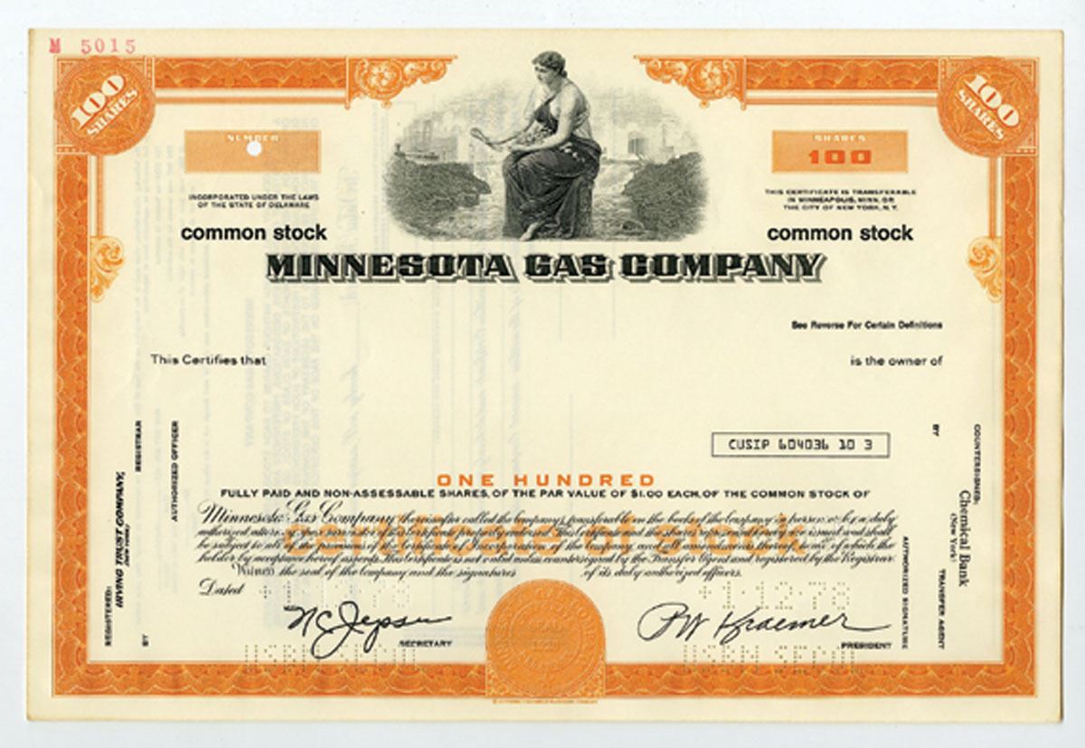 MN. Minnesota Gas Co., 1978 100 Shrs Common Stock Specimen Certificate, XF SCBNC