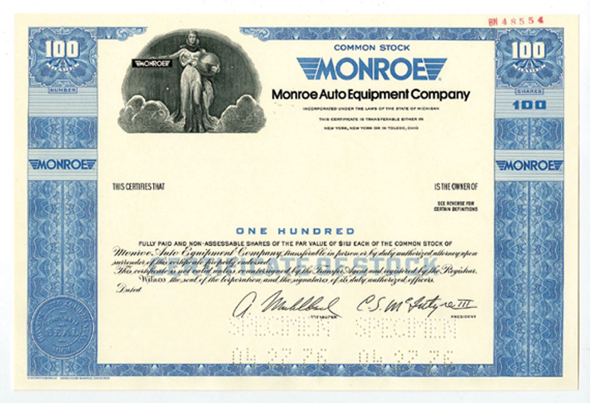 MI. Monroe Auto Equipment Co., 1976 100 Shrs Specimen Stock Cert., VF-XF SC-USBN. Monroe Auto Equipment Company manufactures and supplies automotive equipment. The Company produces suspension and brake products for motor vehicles as original equipment, and for the secondary market.