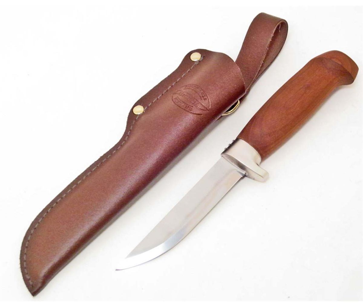 Marttiini Lynx 161. 8 7/8" overall. 4 1/4" stainless blade. Stained birch handles. Brown leather belt sheath.