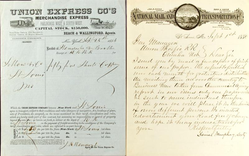 Lot of two items. 1) A Union Express Co's Merchandise Express Via Railroads West & South-West receipt. The addresses of the New-York and Boston offices are listed at the top left, just below a small railroad vignette. A vignette of a shipping vessel occupies the same area on the top right. Datelined New York, Sept. 25, 1851. The items, 55 "sheets copper," were sent to St. Louis at a tariff of $1.50 cts. per 100 lbs. It was signed for by J. (illegible), Agent for the Union Express Co. 2) A letter form the National Mail and Transporting Co. The company name is written inside an ornate border at the top. At the center top is a round vignette showing a U.S. Mail stagecoach pulled by four horses. Names listed on the masthead are: President (upper left corner), Vice-President (upper right corner), Gen'l Manager (lower left), and Secretary (lower right). Datelined St. Louis, MO, Sept. 1, 1888, it was addressed to the Union Pacific R.R. Gen'l Manager, and written by Daniel Murphy (Secretary). It concerns the publication of 10,000 copies of a paper for "gratuitous distribution." It was to be "placed in the hands of 12000 different persons. The inserted advertisement of your Road free of charge and hope it may induce travel for your... Respectfully, Daniel Murphy, Secty."