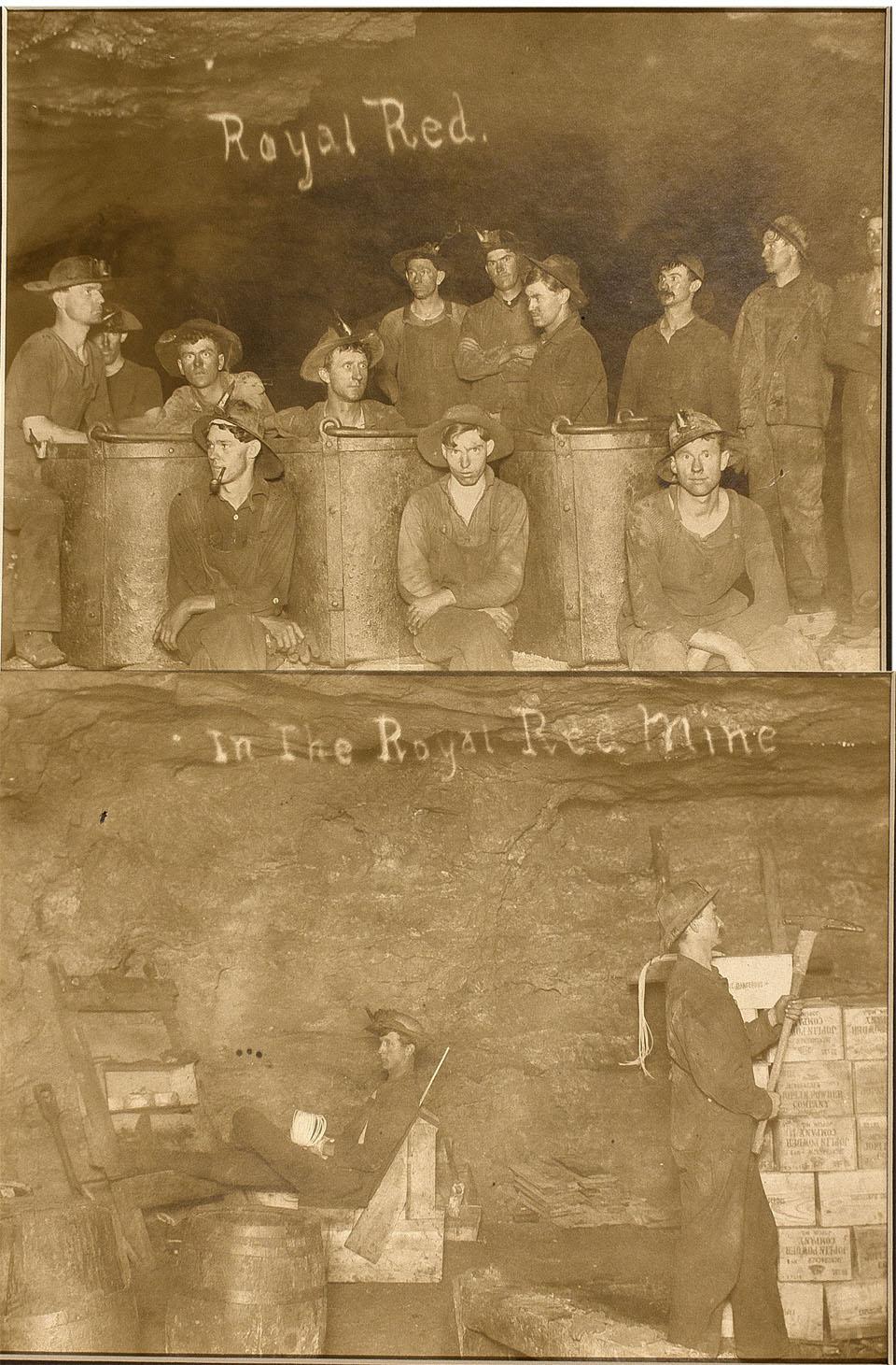 Lot includes 2 photographs, both measuring 7 1/2" x 5 3/4", in dark green mattes measuring 12" x 10": 1) group image of 13 miners posing, some kneeling behind ore buckets, in a relaxed setting underground. "Royal Red" appears in white near the upper center. 2) Two miners, one sitting on a wooden chair with his feet up, while the other walks away holding his axe out in front of him. "In The Royal Red Mine" appears in white across the top border. Both have medium contrast and good focus. No photographer listed for either piece. In the first image several of the miners look quite young, with a few looking a bit older. Based on the presence of "teapot" style headlamps, we believe this mine was in the midwest rather than the far west. Boxes in the second image are from the Joplin Powder Company, Joplin, MO. Fuses are also visible behind the miner on the right, and possibly in the hands of the miner on the left. While no specific information could be found related to the "Royal red Mine," these images might depict a lead/zinc mine in the midwest region.