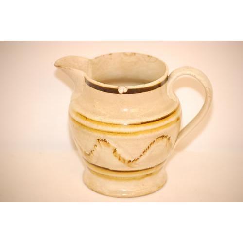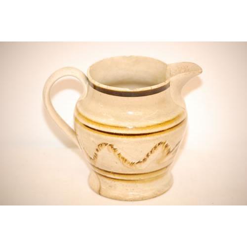 MOCHA CREAMWARE PITCHER W/ EARTHWORM DECORATION ON CREAM COLORED GROUND & THIN BROWN & HONEY COLORED BANDS (4 3/4" T X 6" W W/ HANDLE) - 6" BASE & BODY CRACK, GLAZE CRAZING W/ STAIN, RIM CHIPS, IMPERFECTIONS