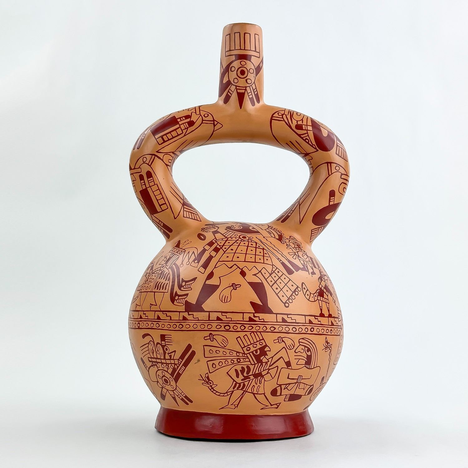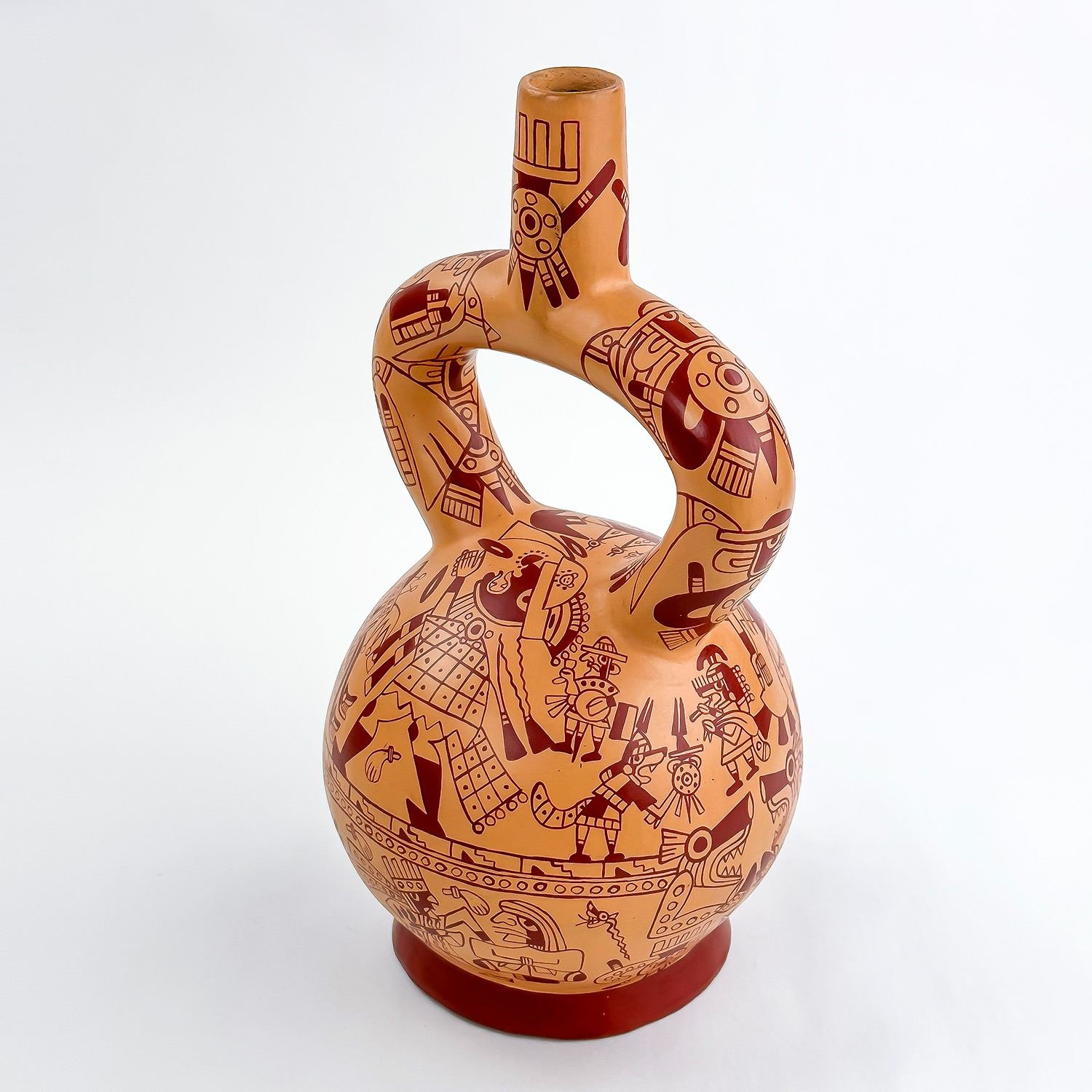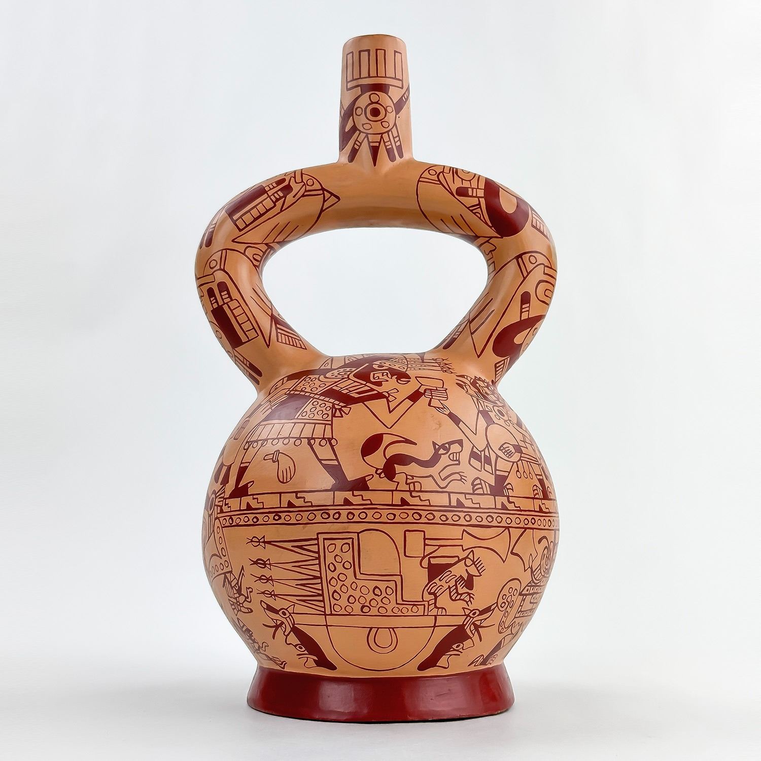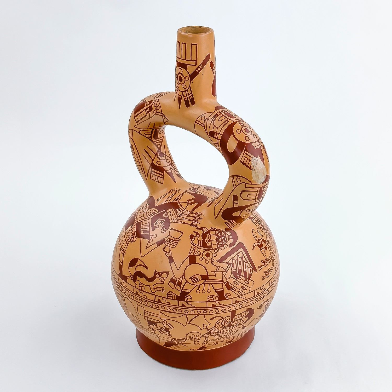 #8003 - MOCHE CULTURE OF PERU’S NORTHERN COAST - STIRRUP SPOUT VESSEL. VESSEL TAKES ON THE SHAPE OF A STIRUP ON A HORSE SADDLE. THIS CERAMIC CLAY POTTERY VESSEL - MARKED REPLICA ON BOTTOM. EXACT MAKER UNKNOWN. MEASURES: 10” (25 CM) TALL BY 5.5” (14 CM) DIAMETER
