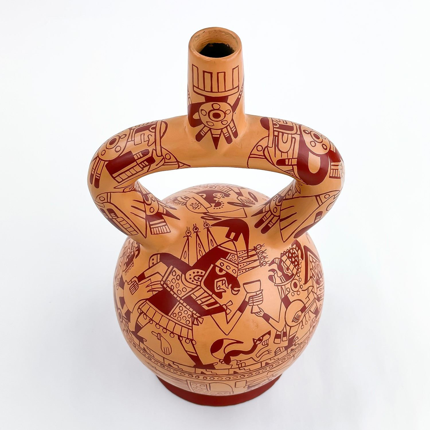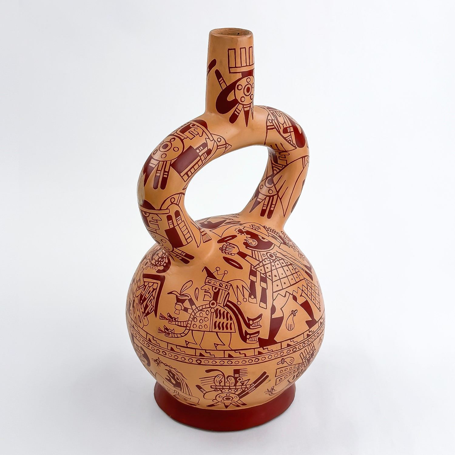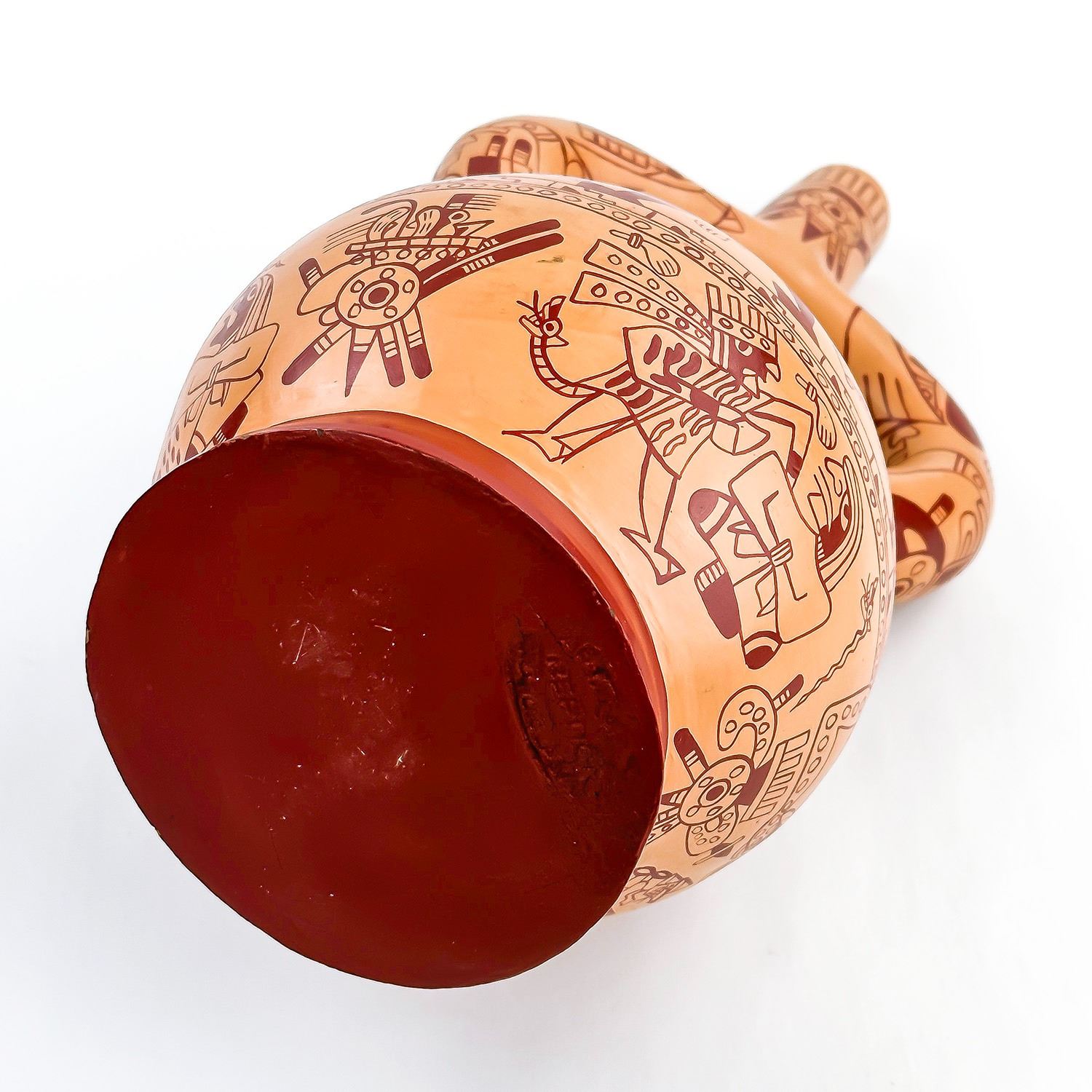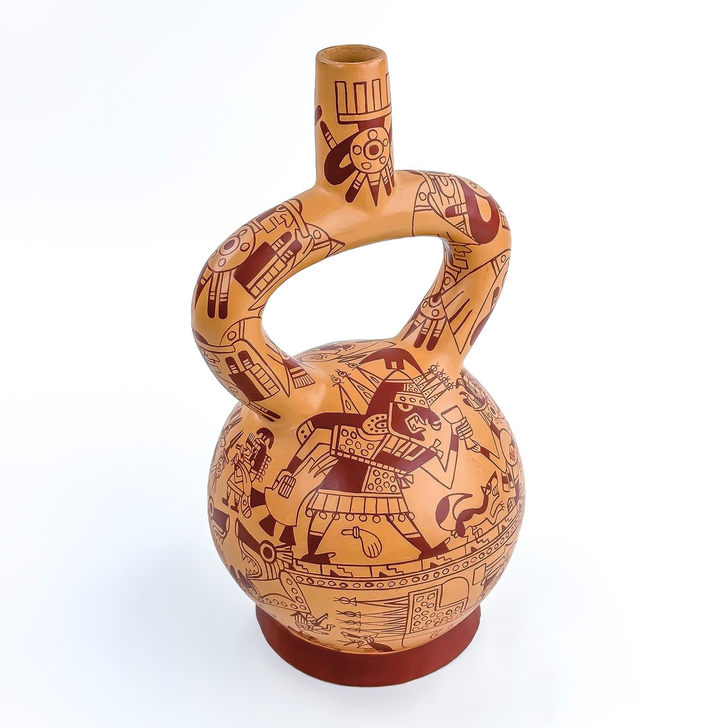 #8003 - MOCHE CULTURE OF PERU’S NORTHERN COAST - STIRRUP SPOUT VESSEL. VESSEL TAKES ON THE SHAPE OF A STIRUP ON A HORSE SADDLE. THIS CERAMIC CLAY POTTERY VESSEL - MARKED REPLICA ON BOTTOM. EXACT MAKER UNKNOWN. MEASURES: 10” (25 CM) TALL BY 5.5” (14 CM) DIAMETER