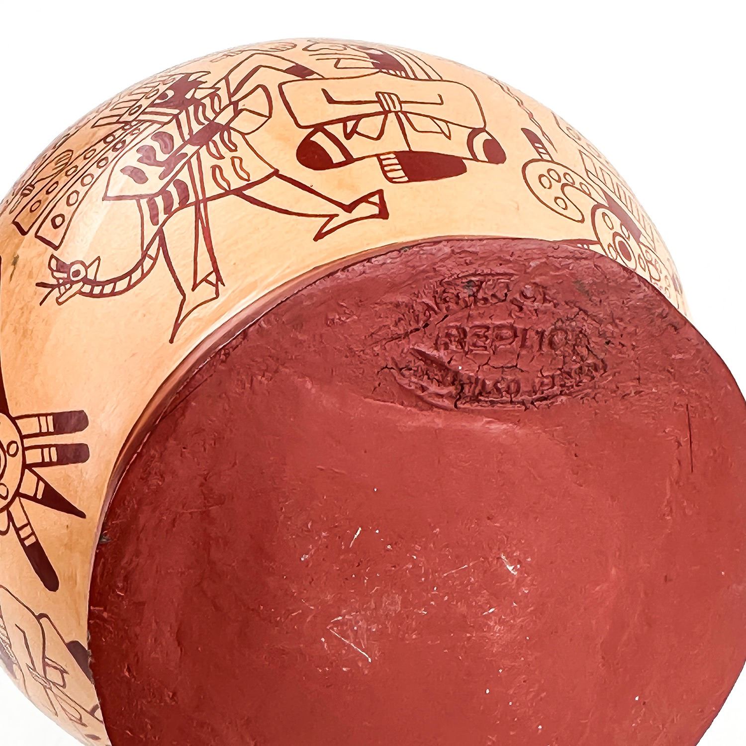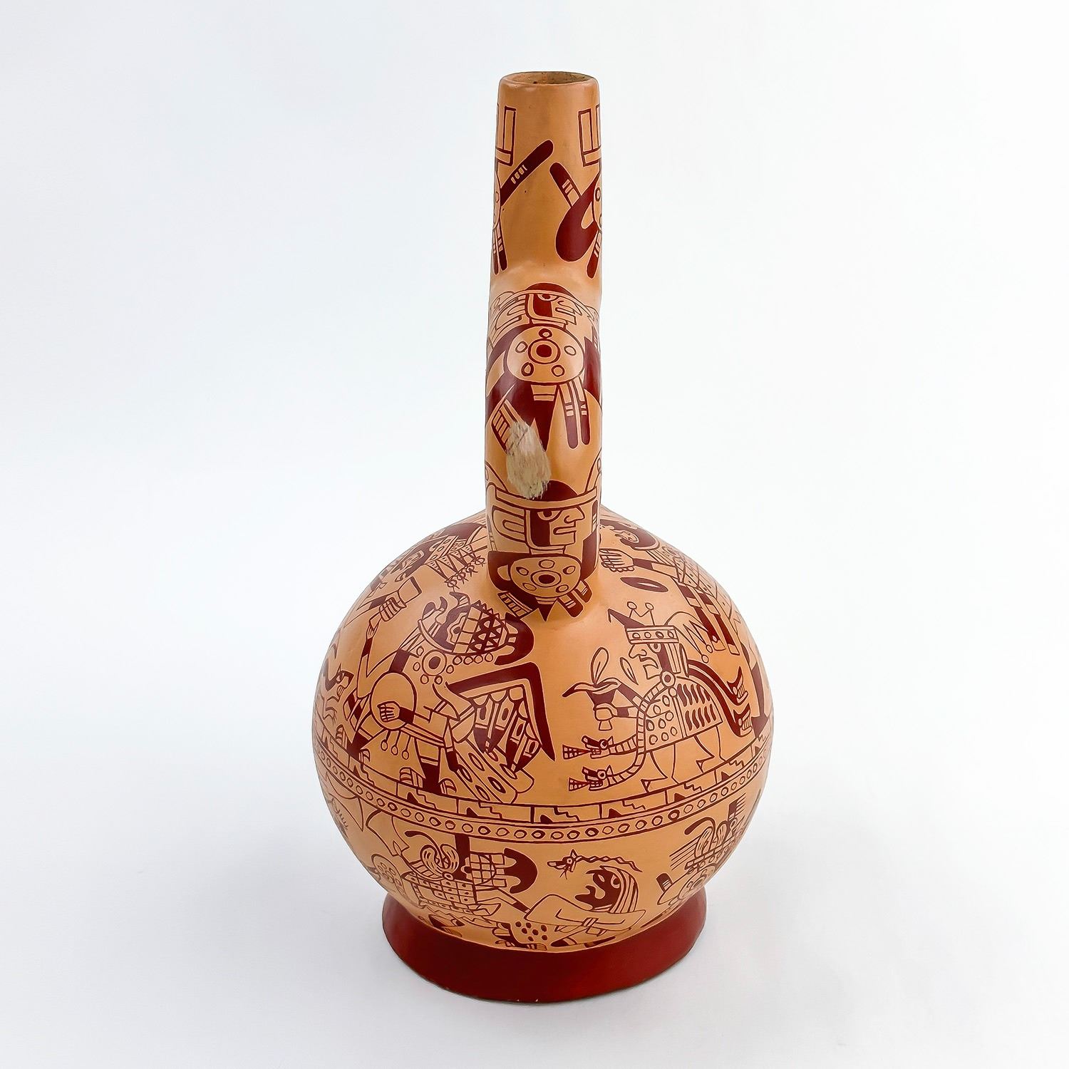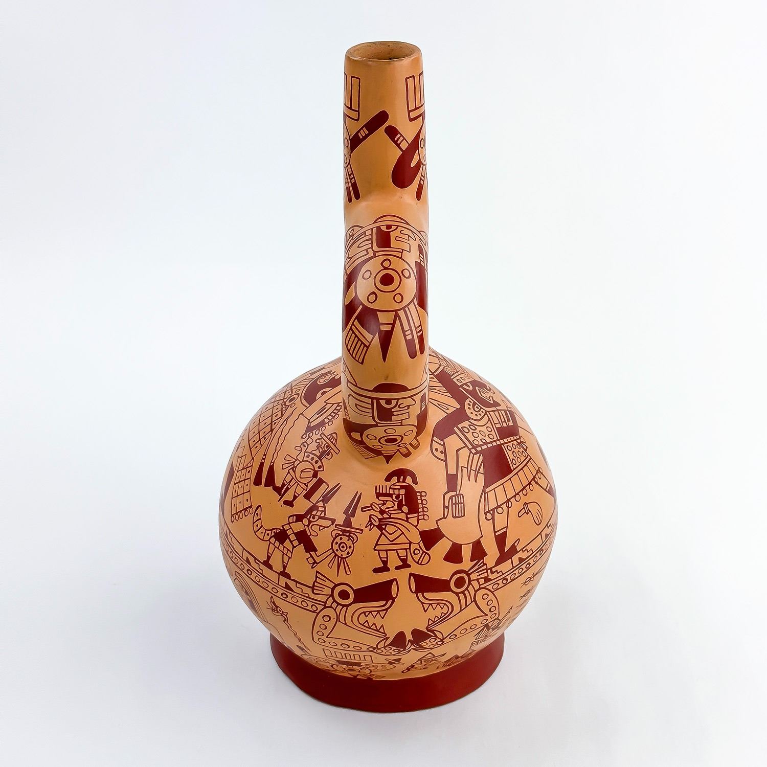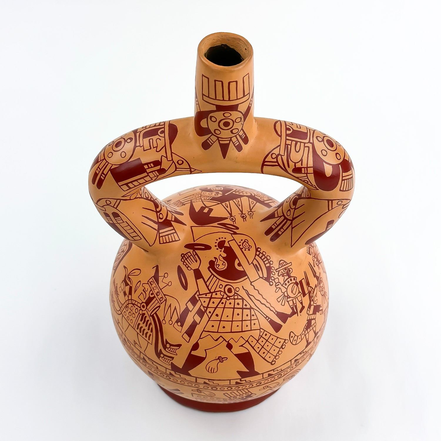 #8003 - MOCHE CULTURE OF PERU’S NORTHERN COAST - STIRRUP SPOUT VESSEL. VESSEL TAKES ON THE SHAPE OF A STIRUP ON A HORSE SADDLE. THIS CERAMIC CLAY POTTERY VESSEL - MARKED REPLICA ON BOTTOM. EXACT MAKER UNKNOWN. MEASURES: 10” (25 CM) TALL BY 5.5” (14 CM) DIAMETER