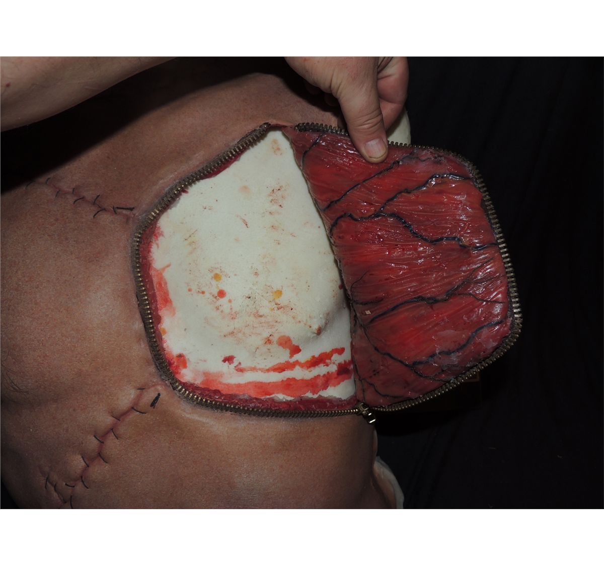 This is the Hero silicone full chest appliance JERRY O'CONNELL wears throughout the recent MUNSTERS retooling MOCKINGBIRD LANE 1313. Has a working zipper around his heart. Sits on a life cast of Jerry for display.