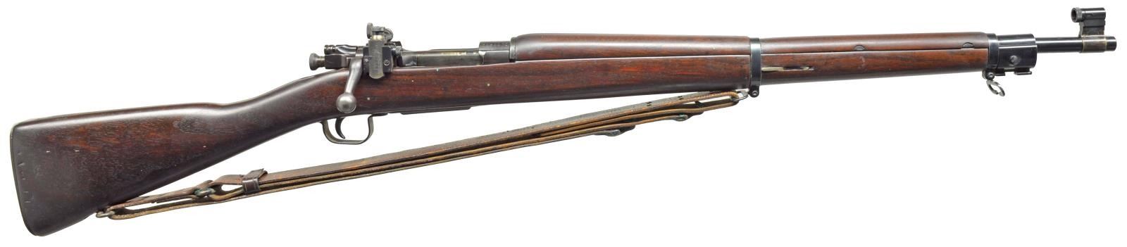 Cal. 30-06. S# 3992575. Bbl. 24". U.S. 1903 A3 rifle, reconfigured w/ target sights. Receiver fitted w/ Lyman No. 48 aperture rear sight, which has target knobs, graduated to 60 points of elevation. Lyman globe front sight w/ post insert. Bbl. marked “R?8-43”. Bolt & cut off are marked “R”. All stamped furniture, including trap buttplate. Plastic oiler in butt. Straight grip walnut stock w/ 2 reinforcing pins. Vintage Lawrence Model 1907 sling. CONDITION: stock has been refinished w/ loss of wood in inletted areas. Light wear & handling marks. Metal has been reblued w/ light wear & handling marks. Very good, shiny 4 groove bore. (20-1627/RW). CURIO. $400-600.