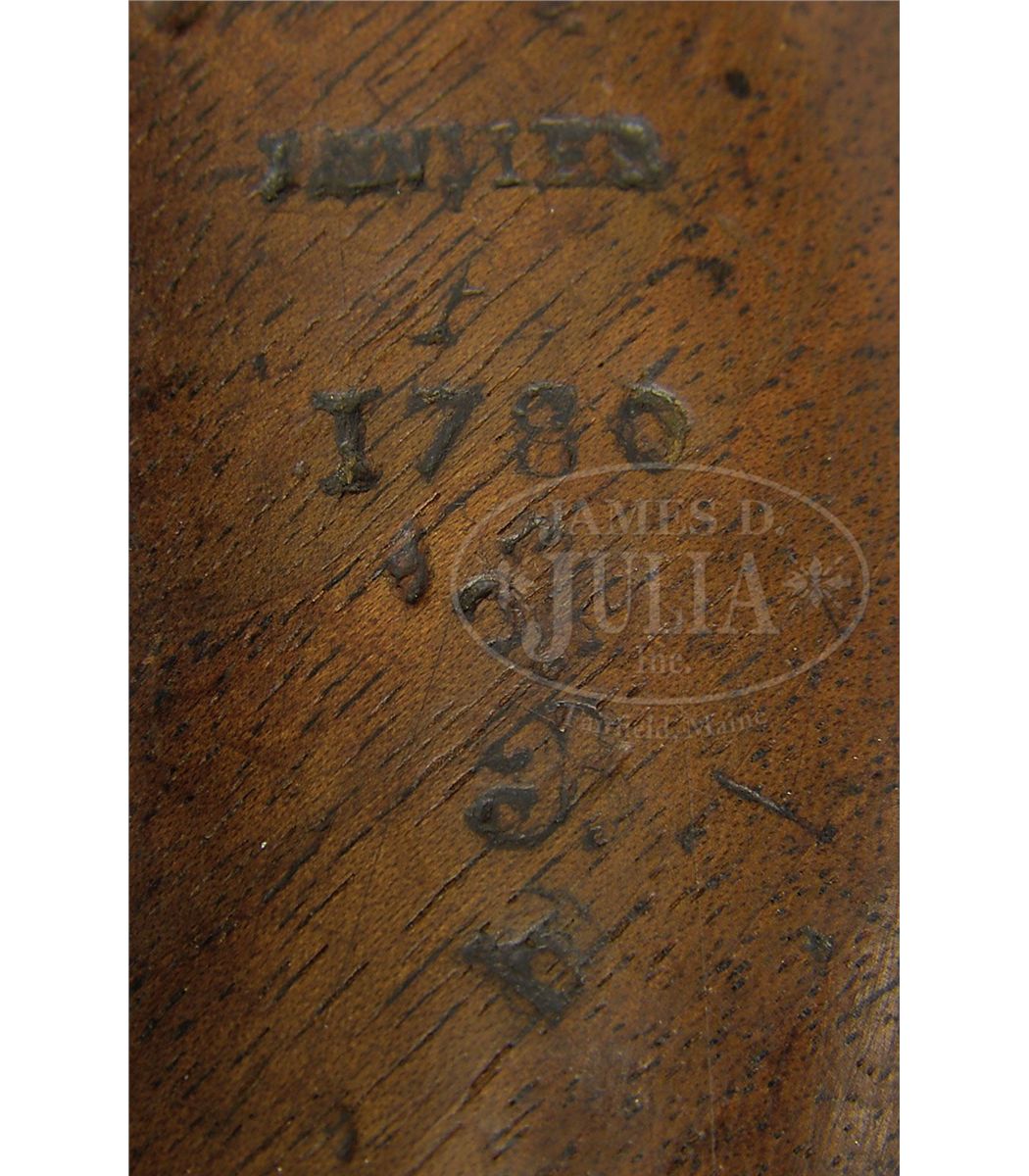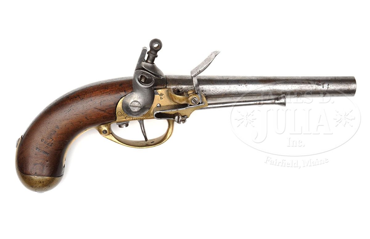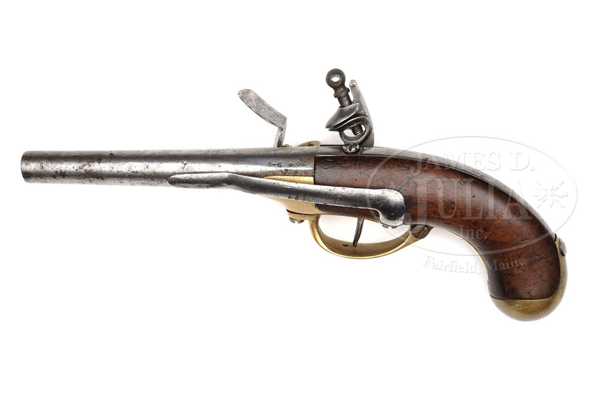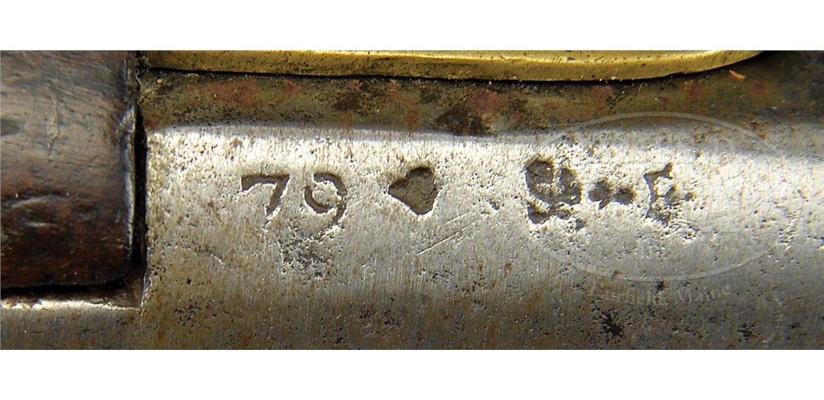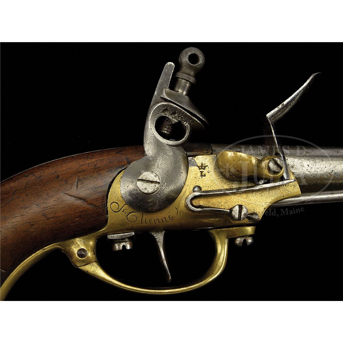 Cal. 69. This is a nice Revolutionary War dated single shot pistol from which the first American martial pistol was copied by North & Cheney. This gun has a 7-1/2" rnd bbl with several proofs, including a "79" denoting manufacture in 1779 in the midst of the American Revolution. This gun's unique design features a brass frame marked "St Etienne" below hammer and a crown over an "L" forward of hammer. Stocks have various proof marks, including inspection date of "1780". Attached to gun is also found an orig integral belt hook, not often present on this model. CONDITION: Metal overall is cleaned and gray with pitting. Brass frame, trigger guard and buttcap have mustard colored patina with numerous small scrapes, dents and dings. Stocks are sound and solid, fairly well fit but with gaps at frame, as can be seen in photos. Gun appears all orig with exception of hammer. Mechanically gun functions well. 4-49307 JS34