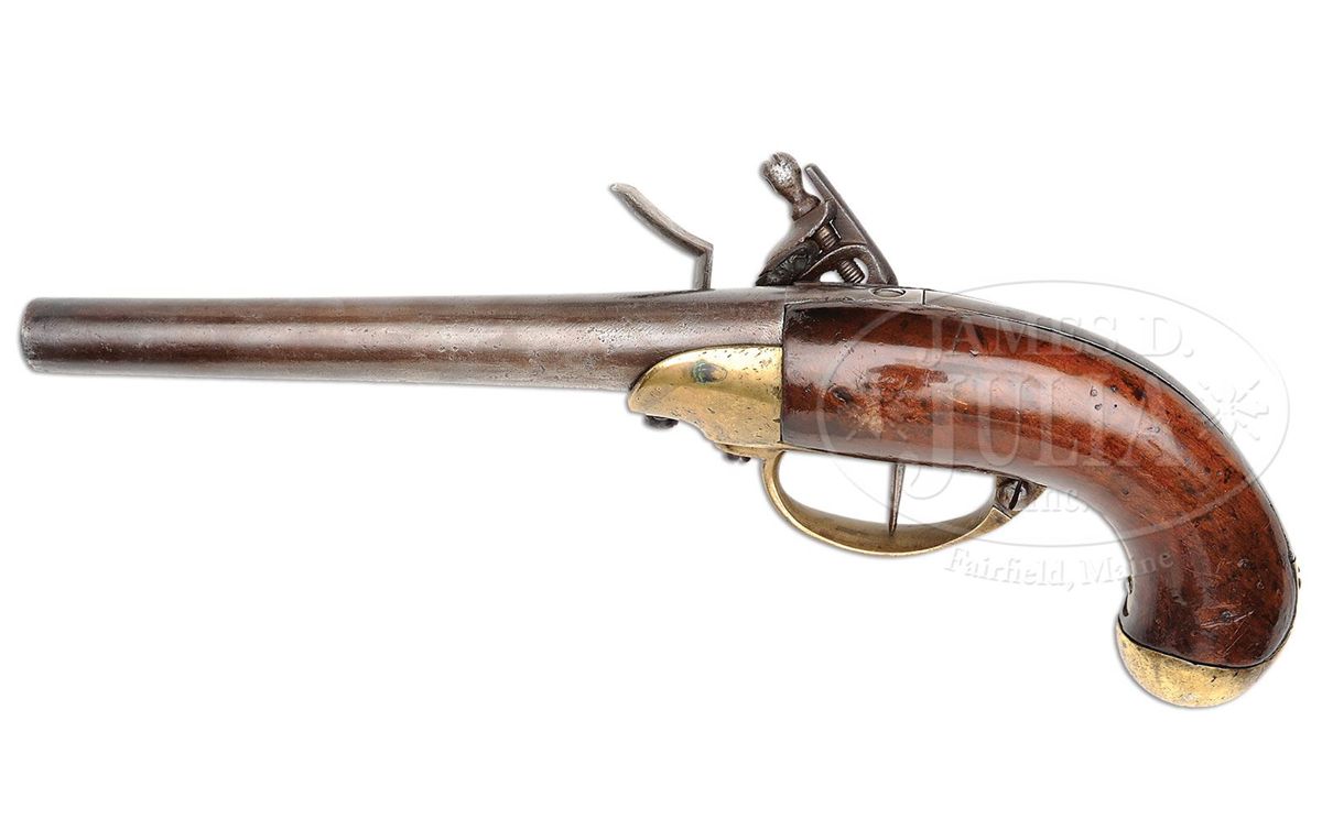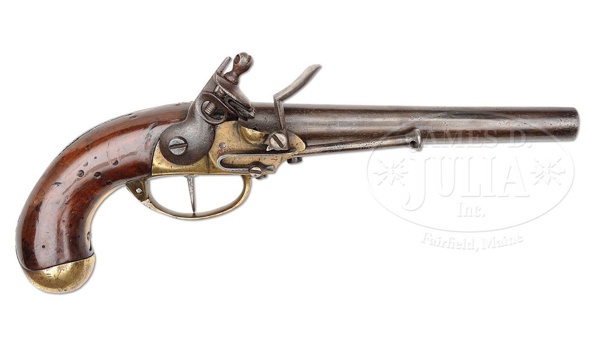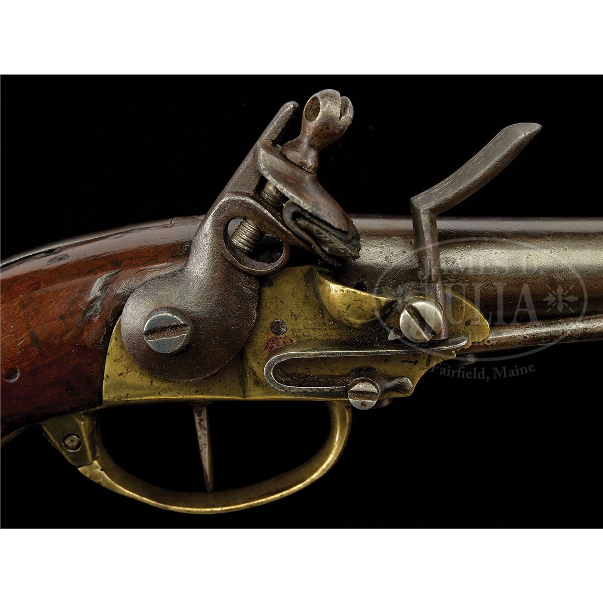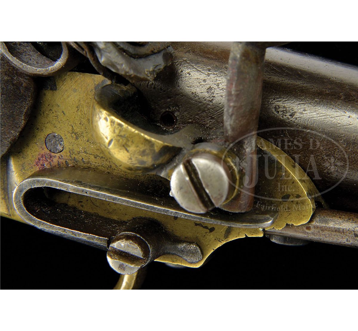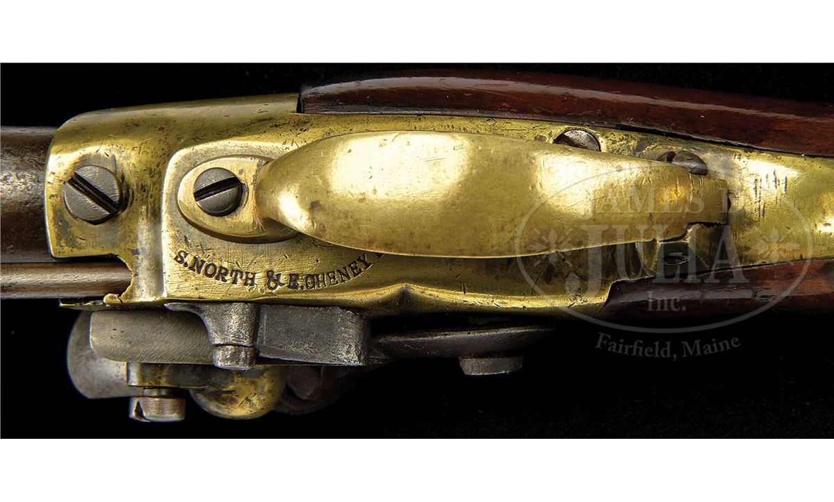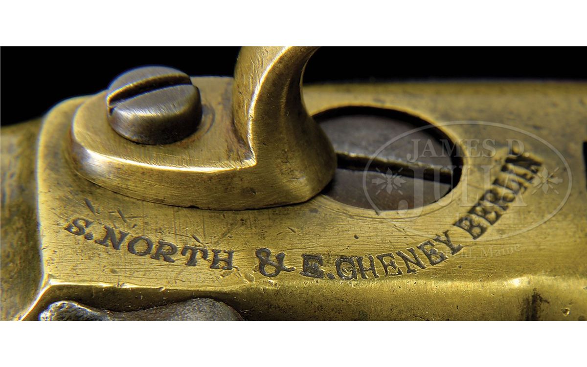 SN 354. SN 354. Cal. 73. x 8-1/16" unmarked rnd bbl numbered on right side of tang "35" (4 not clearly visible) in back of tang marked "IV". Underneath bbl is "354" and ".." which matches the same ".." on the left side of bbl tang. Brass frame is marked underneath "S. NORTH & E. CHENEY BERLIN". Serial number "354" marked inside frame. Like the frame, the butt cap is made of brass. "IV" is present on the backstrap, bridle, tumbler, buttcap, trigger guard and main spring. Cherry stock is unmarked. Here is the opportunity to own the Rosetta Stone of United States martial pistols. Simeon North and Elisha Cheney signed a contract with the Government to manufacture 500 pistols on March 8, 1799 and were the first pistols manufactured entirely by a contractor, as all previous procurements were assembled from parts either in storage or made by various people. These new pistols were derived from the French Model 1777 Pistol with several improvements incorporated such as approximately 1/2" longer bbl and an additional screw securing the frame to the bbl. These first 500 were marked “S.NORTH & E. CHENEY BERLIN” along the brass frame while the second contract were marked “NORTH & CHENEY BERLIN”. With these first 500 pistols delivered by early 1800, a second contract was forthcoming to Simeon North and Elisha Cheney for 1,500 pistols dated February 6, 1800. The final delivery of the 1,500 pistols were delivered by mid-year 1801 and effectively launched Simeon North into his pistol making venture that lasted another 25 years. PROVENANCE: See Auction Catalog of 1984. Collection of Dr. Douglas Sirkin. CONDITION: Iron bbl and tang are in very good condition with only slight evidence of pitting as bbl appears to have been cleaned at one time with remnants of the "V" (view mark) partially visible and now shows a light color. Area around touch hole has an overall light brown patina. Frizzen fits loosely, may be replaced as it and the cock do not carry assembly numbers, but if replaced it was very well done and matches the correct pattern and color. Brass frame and butt cap are in very good condition with all markings sharp and clear. Has not been cleaned and shows numerous nicks, dings and scratches from normal handling. Cherry stock is correct having no cracks or wood losses. Pistol is original flint. Considering that less than two dozen of these rare and historic martial pistols are known to exist of the 2,000 orig delivered, this gun being a first model (about 6 are known) would make this an important addition to any advanced martial pistol collection. 4-49982 PAS59