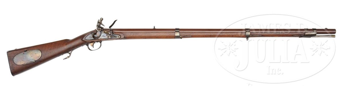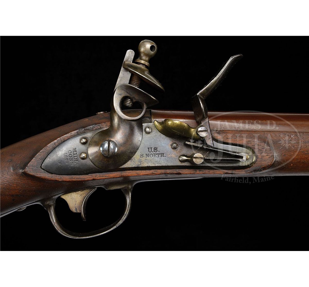 NSN. .54 cal. rifled bbl with 6 grooves 36" long marked "AH" (Asabel Hubbard) over "P" in a sunken rosette at left breech and dated 1827 on tang. Lock is marked "U.S." over "S. North" over the brass inclined pan and marked "MIDLt" over "CONN" over "1829" in three lines reading vertically behind cock. Walnut stock is normal in all respect with remnants of the inspector's cartouche opposite lock and inscribed "J. W. Delay" on left buttstock. PROVENANCE: Collection of Dr. Douglas Sirkin. CONDITION: Bbl has been reconverted to flintlock and has been nicely re-browned. Lock mechanism is org flintlock with all parts matching except top jaw and screw. Balance of metal work has not been refinished and retains its associated aged finish, ramrod is org only middle band missing sling swivel, easily replaced. Walnut stock is very good showing no major losses, only handling nicks lightly stamped with "A1194" in front of buttplate in 1/4' high letters. Overall fine condition for its age. 4-49949 PAS3
