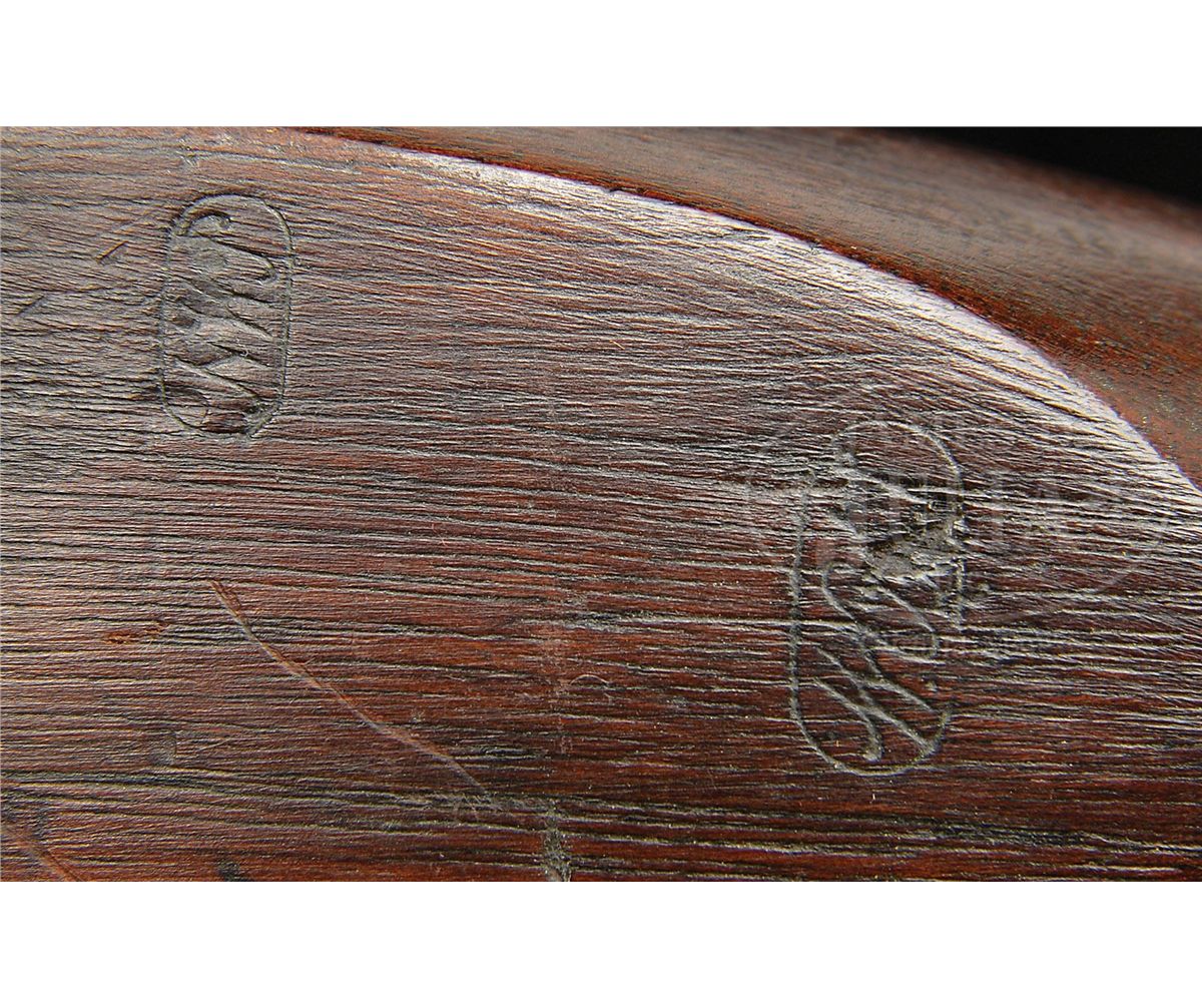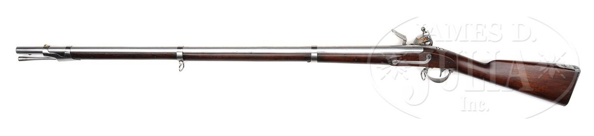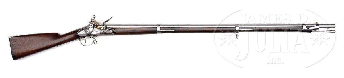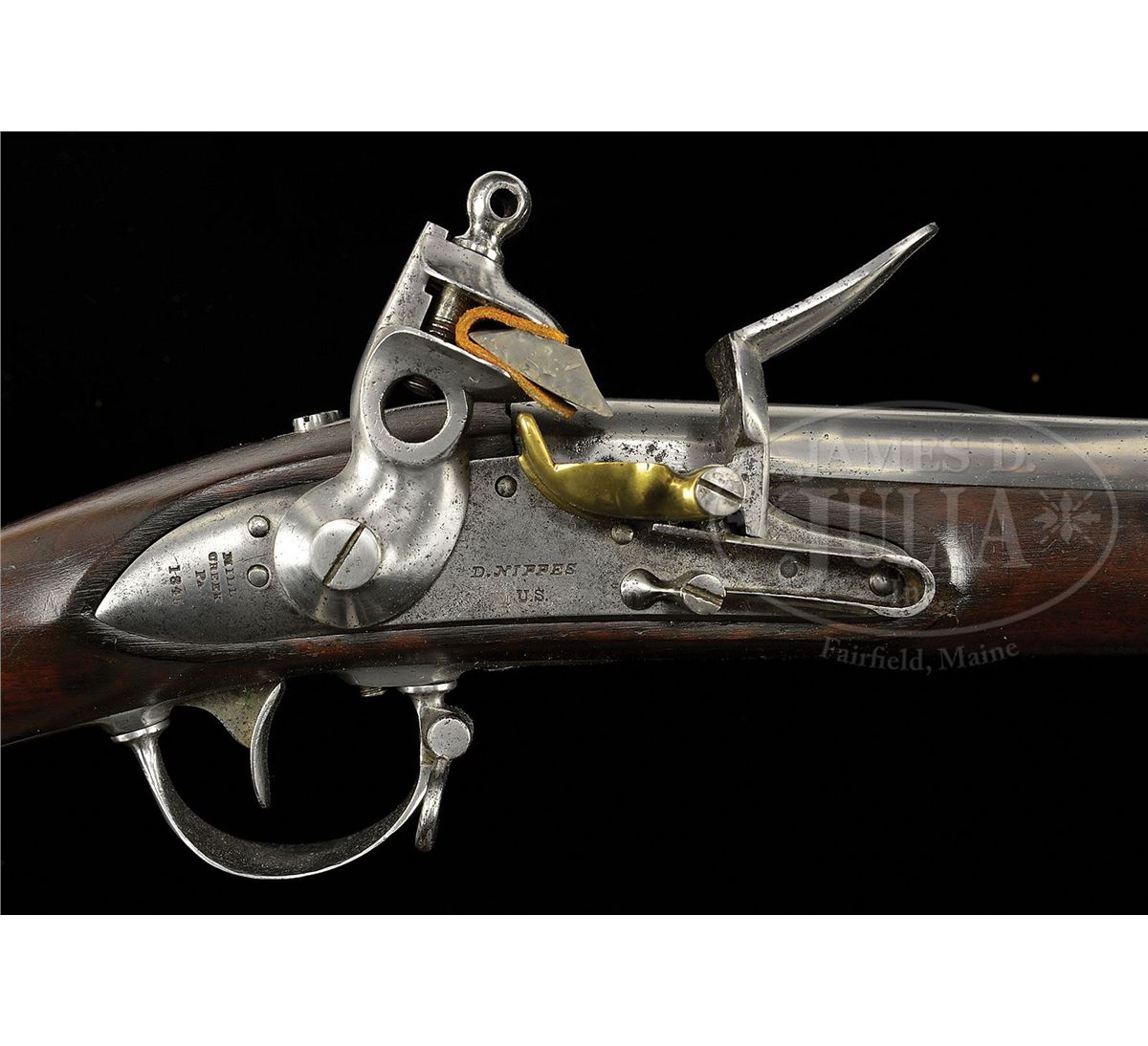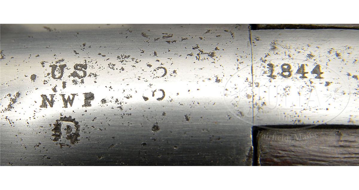 NSN. .69 Cal. x 42" long bbl marked at breech "US/NWP/P" in a sunken rosette (Nahum W. Patch), marked "36" and dated 1844 on tang. 6-1/4" long lock marked under brass pan "D.NIPPES/U.S." and behind the cock "MILL/CREEK/PA/1845" in four lines reading vertically. BBl bands, trigger guard, US marked buttplate marked(36), side plate all orig model 1840 pattern. Orig ramrod and sling swivels intact. American black walnut stock measures 55" long and marked opposite the lock in script, "NWP" and "WAT" indicating acceptance by William Anderson Thornton. CONDITION: Bbl is in very good condition over all very light pitting with moderate pitting around touch hole and associated lock area. Balance of metal work shows light pitting and has been lightly cleaned. Accompanying this gun are x-rays of the touch hole area confirming this musket is orig flintlock. Stock is in fine condition with just a few handling scratches and dents and retains very sharp inspectors marks opposite the lock. 4-47325 PAS38