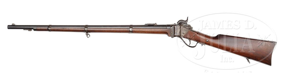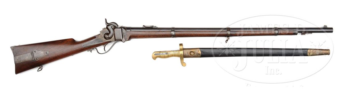 SN 40163. Cal. 52. This is a fine example of the popular new Model 1859 3-band Sharps rifle with matching bayonet and scabbard. Bayonet is stamped on flat of grip with "1". Gun is in overall fine condition. Markings are all crisp and discernible. Stocks are sound and solid. There is a piece of paper found in patchbox that has an ancestor's note concerning First Sergeant Marvin P. Raymond of the 1st Regiment, United State's Sharpshooters who was killed at Blackford's Ford on Sept. 19, 1862. We have no idea of attribution but note is there. Further research on this SN may show possible tie. CONDITION: Very good to fine overall. Bbl retains traces of orig blue with balance being plum, scattered staining. Stock is sound and solid and shows no cartouches. Frame, breech and lever are gray and smooth with areas of staining. Bayonet matches gun for condition with bright gray blade marked "Collins & Co, Hartford 1861". Bayonet scabbard is in good condition, point has been reshaped and sharpened.ÊÊScabbard appears restored, at least scabbard body has been re-dyed. 4-47322 JS8