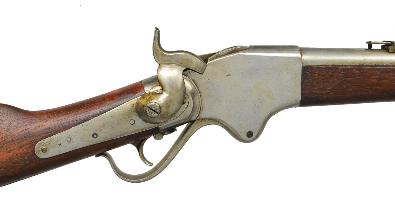 Cal. 56-60. S# 34073. Bbl. 33". Standard configuration of a rifle made 1865-1869 which many saw service in the Indian wars. S# on left side of breech w/ out "C". Frame numbered on the tail. “MODEL 1865” & 4 line address “SPENCER REPEATING RIFLE / PAT’D MARCH 6 1860 / MANUF’D AT PROV. R.I. / BY BURNSIDE RIFLE CO” on top of frame. The main difference between 1860 & 1865 models externally are the plumb fit hammer face & Stabler device which allowed for single shot use w/ out extraction. CONDITION: very good overall, complete & matching. Markings in metal are very good. Stocks are sound as refinished. Buttstock has lg. putty repair rear of frame. Single cartouche is visible in outline. Mechanically fine including stabler device. Bore is clean w/ discernible rifling. (01-19371/JS). ANTIQUE. $1,500-2,000.