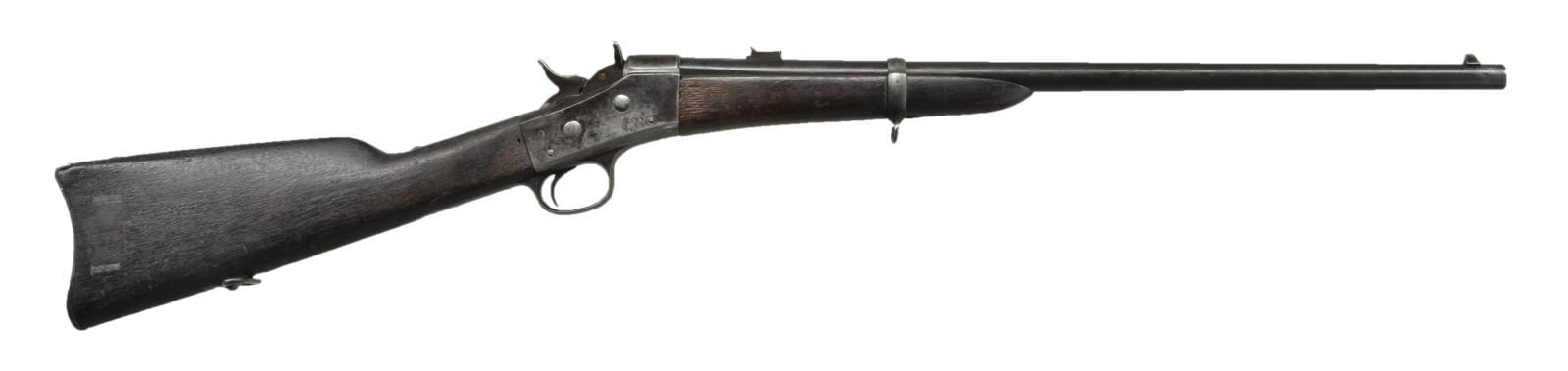 Cal. 50-45. S#2760. Standard configuration, 23.25” bbl. with 9” forestock with spring retained bbl. band with sling swivel, 2nd swivel is butt, 2-line Remington address & patents on tang. Naval inspection on right side of frame and anchor stamp on top of barrel at breech. CONDITION: very good overall, some finish on barrel, scattered staining & pitting, stocks sound with erosion and cosmetic blemishes. Crisp action and bright shiny rifled bore. (01-21505/JS). ANTIQUE. $800-1,200.