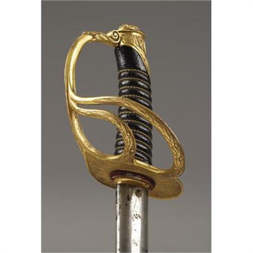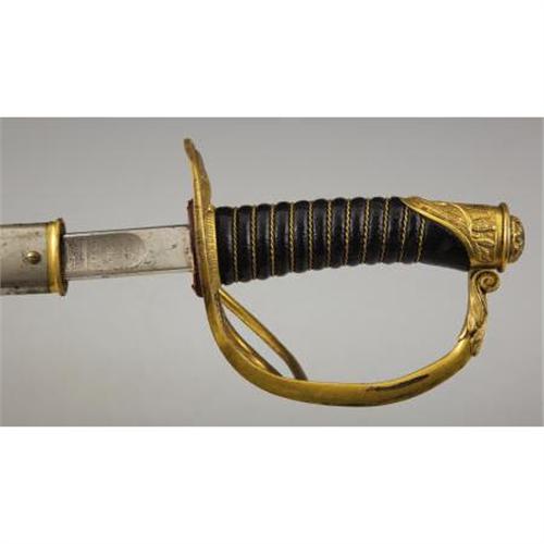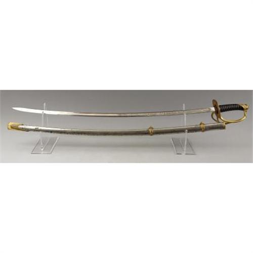 <B>MODEL 1872 U.S. OFFICERS GRADE CAVALRY SABER</B></I> - Nicely etched blade with; 'U.S.', Stand - of - Flags, American Eagle and foliate patterns. Ricasso etched “U.S. Armory - Springfield Mass.” Elaborate gold gilt guard, basket and pommel cap. Original red leather washer intact. Nickle plated scabbard is mounted with decorated hangers and drag which are also gold gilt. Grip leather and twisted wire wrap are 100 percent.<BR><BR><B>Condition:</B></I> Blade has minimal staining, nothing offensive. Nickle scabbard shows scattered erosion and slight lifting of nickel. This is a very nice example of an Indian Wars period cavalry saber.<BR><BR><b>Shipping:</b> Bats, Clubs, Sticks, Swords, Rif (<a target="_blank" href="http://www.heritageauctions.com/common/shipping.php">view shipping information</a>)