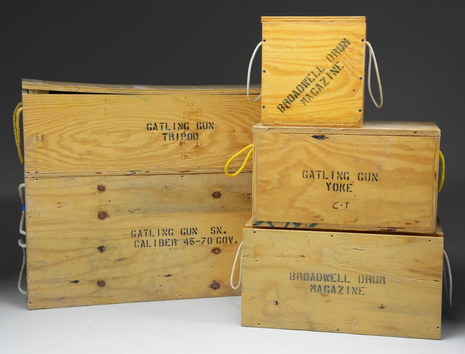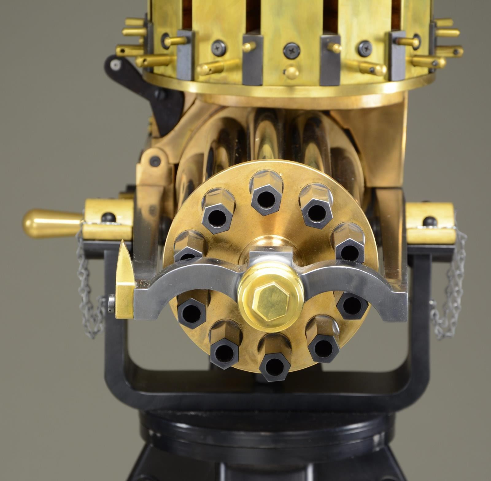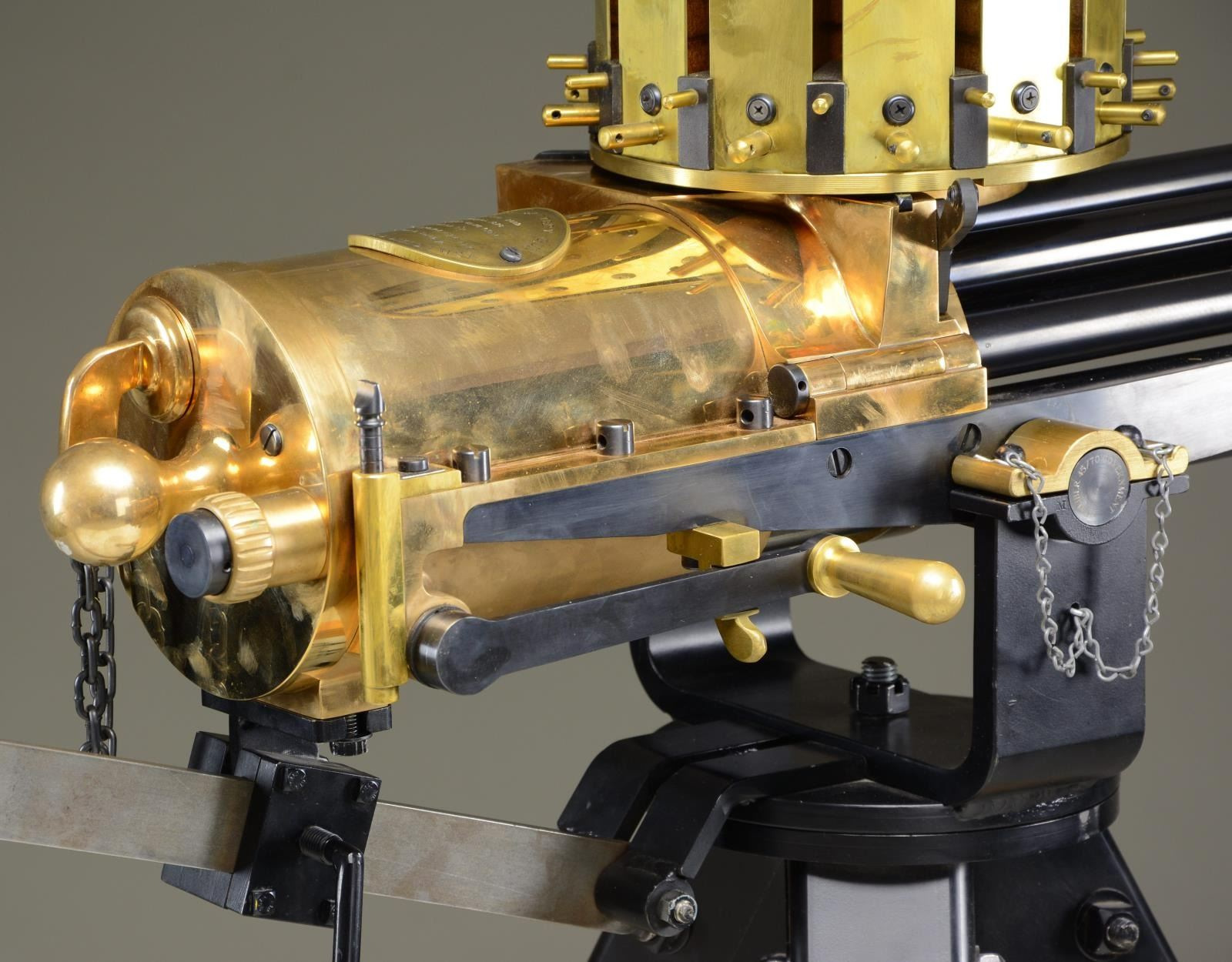BROADWELL DRUMS, MANUFACTURED BY VALLEY ENGRAVING INC. Cal.45-70. S# 014-008. Bbl. 18". Manufactured June, 2009. A full scale, functional modern reproduction of the 1878 Battery Gun. These guns boasted a large round brass receiver with an exposed 10 barrel cluster. Beefy 1.25" trunnions support this functional art piece on its 360º hardwood tripod. This particular example utilizes the equally attractive, 216 round, gravity fed, Broadwell Drums for feeding the massive 45-70 Government rounds. 12 individual slots host the ammo which is gravity fed into the action w/ the assistance of a heavy, steel follower. When the slot is empty the drum is simply advanced to the next slot, until empty. The hand crank used for operation is located on the right side and is rotated clockwise to fire. Elevation adjustments can be made using a 22" handle at the rear of the receiver & it can be locked in position when desirable. 36" hardwood legs host the steel yoke. Front sight is a brass blade that coincides w/ an elevation adjustable rear blade sight. The sight radius of 30". Round barrels w/ the last 2.25" hexagon. Barrels retained w/ brass ring, 3" rear of muzzles. Circular brass data plate on top, rear of receiver engraved; "GATLING'S BATTERY GUN WOODSFIELD, OHIO, U.S.A. / 3 JUNE 2009 / MODEL 1878 / CALIBER 45-70 GOV. / MADE BY / VALLEY ENGRAVING LLC / and NEAL E. SMITH jr." Receiver engraved on right side; "mfd. by VALLEY ENGRAVING LLC, Woodfield, Ohio 43793 / Gatling Gun, Model 1878, caliber 45-70 government / serial number014-008. / distributed by Neal E. Smith jr.8205 Lakeshore Blvd., Mentor, Ohio44060." Top of Broadwell drums engraved; "BROADWELL DRUM - CAPACITY 216 ROUNDS - CALIBER 45-70 GOV. - DATE OF MANUFACTURE 29 DEC. 2008 / GATLING GUN." MAGS: 3 Brass 216 rd. Broadwell Drums. UNATTACHED ACCESSORIES: owners manual & 5 custom wooden transport / storage crates for drums, gun, yoke & tripod. CONDITION: brass has correct staining as untreated brass would. T&E mechanism moves smooth & fluid as does the entire fire control mechanism. All aspects indicate little use, if any. Bores bright w/ strong rifling. PROVENANCE: from The Collection of Gun Sport Ltd owned by Jon R. Thomas. (23-1670/JZ). MODERN. $14,000-24,000.