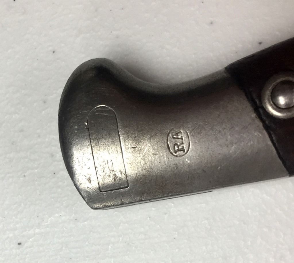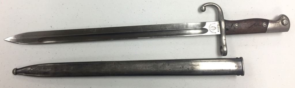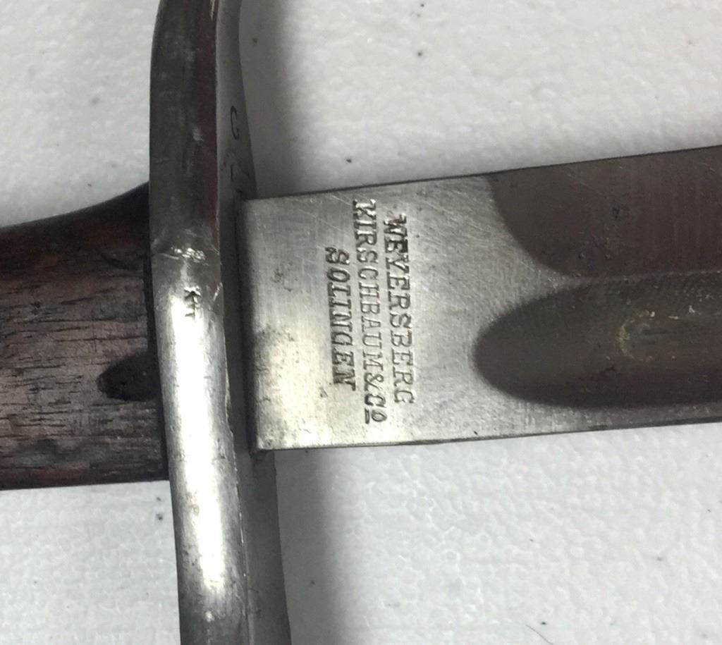 BAYONET. MARKED MODELO ARGINTINO 1909. MADE BY WEYERSBERG KIRSCHBAUM CO SOLINGEN, GERMANY. MATCHING SERIAL NUMBERS ON BAYONET AND SCABBARD. ALL STEEL SCABBARD. OVERALL LENGTH 522MM (20.5 INCHES). VERY GOOD