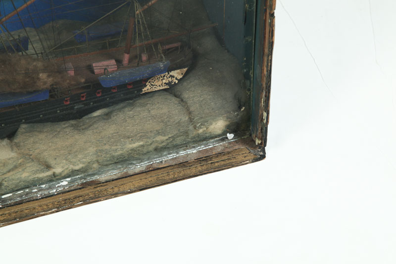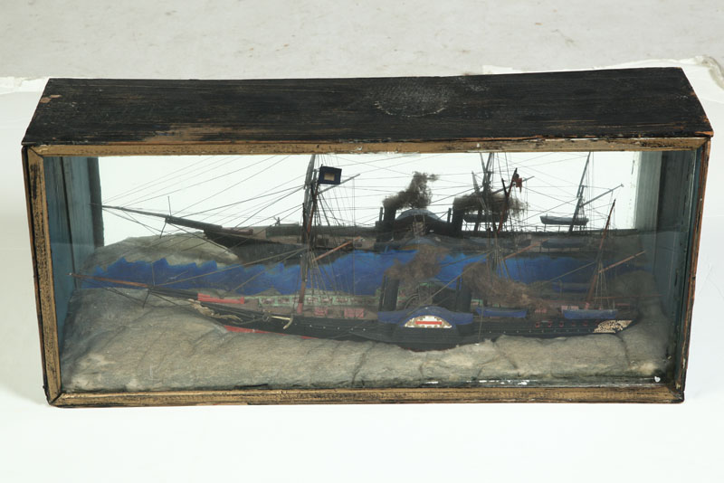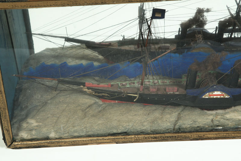 MODEL OF AN EARLY STEAM SHIP WITH AMERICAN FLAG.
