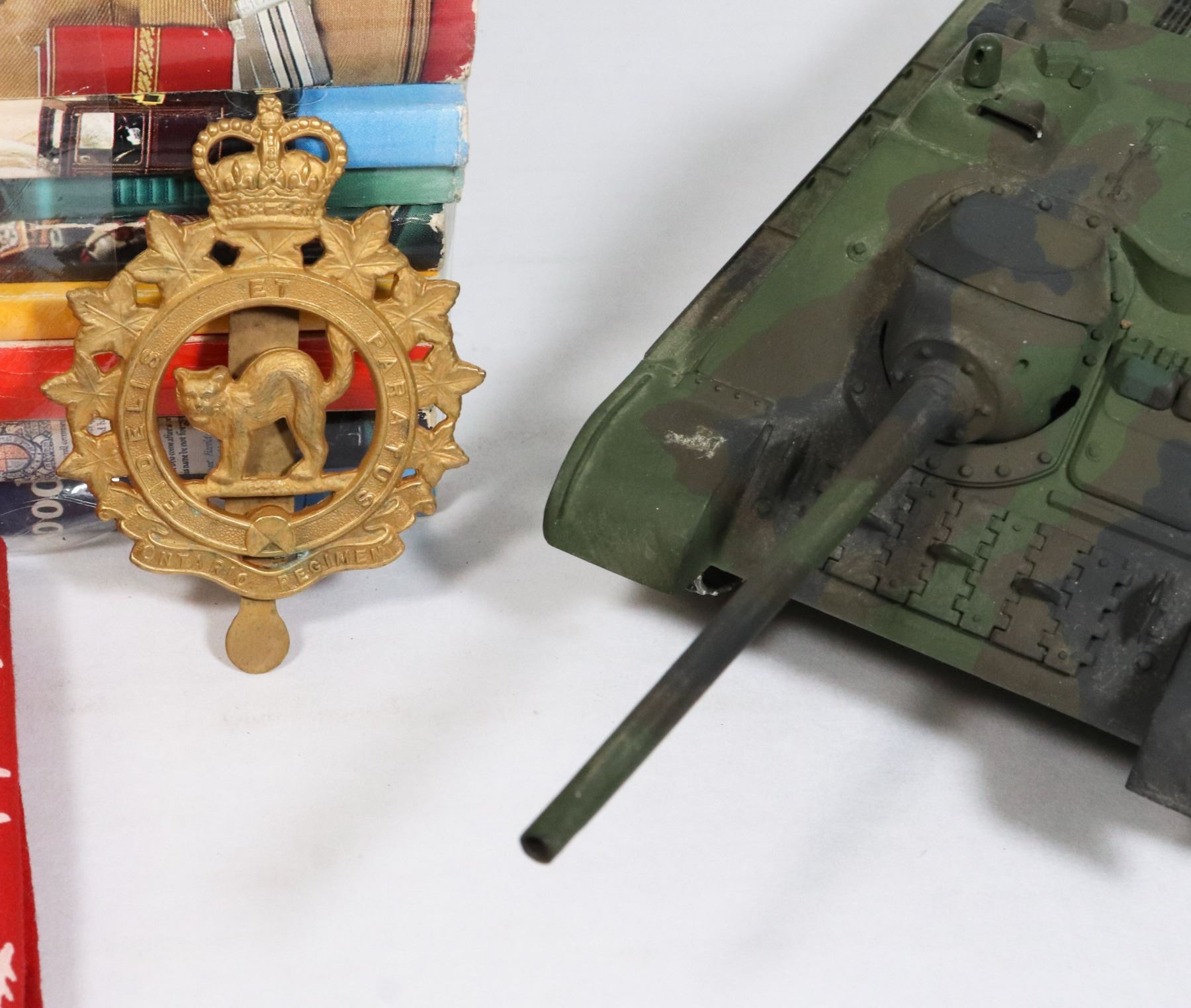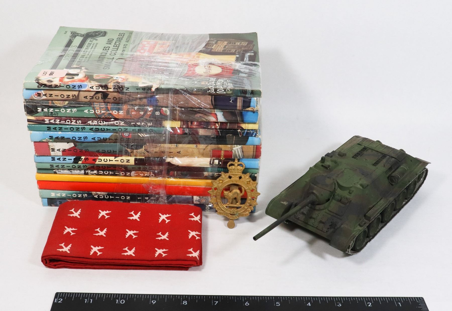 SCAFF (B-52 BOMBERS), ONTARIO REGIMENT CAP BADGE, 14 MILITARY AND COLLECTORS AUCTION BOOKS FOR REFERENCES