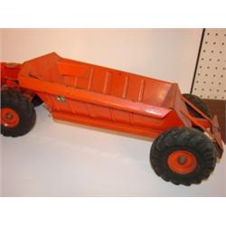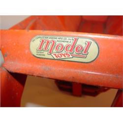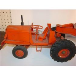 MODEL TOYS TRACTOR & TRAILER. Tractor has original label "The Charles Wm. Doepke Mfg. Co.-Model Toys". Tractor is missing seat. Tractor is marked "Euclid". Trailer has "Euclid-The Pioneer" label on both sides. Rusting to both tractor & trailer. 27.25" L